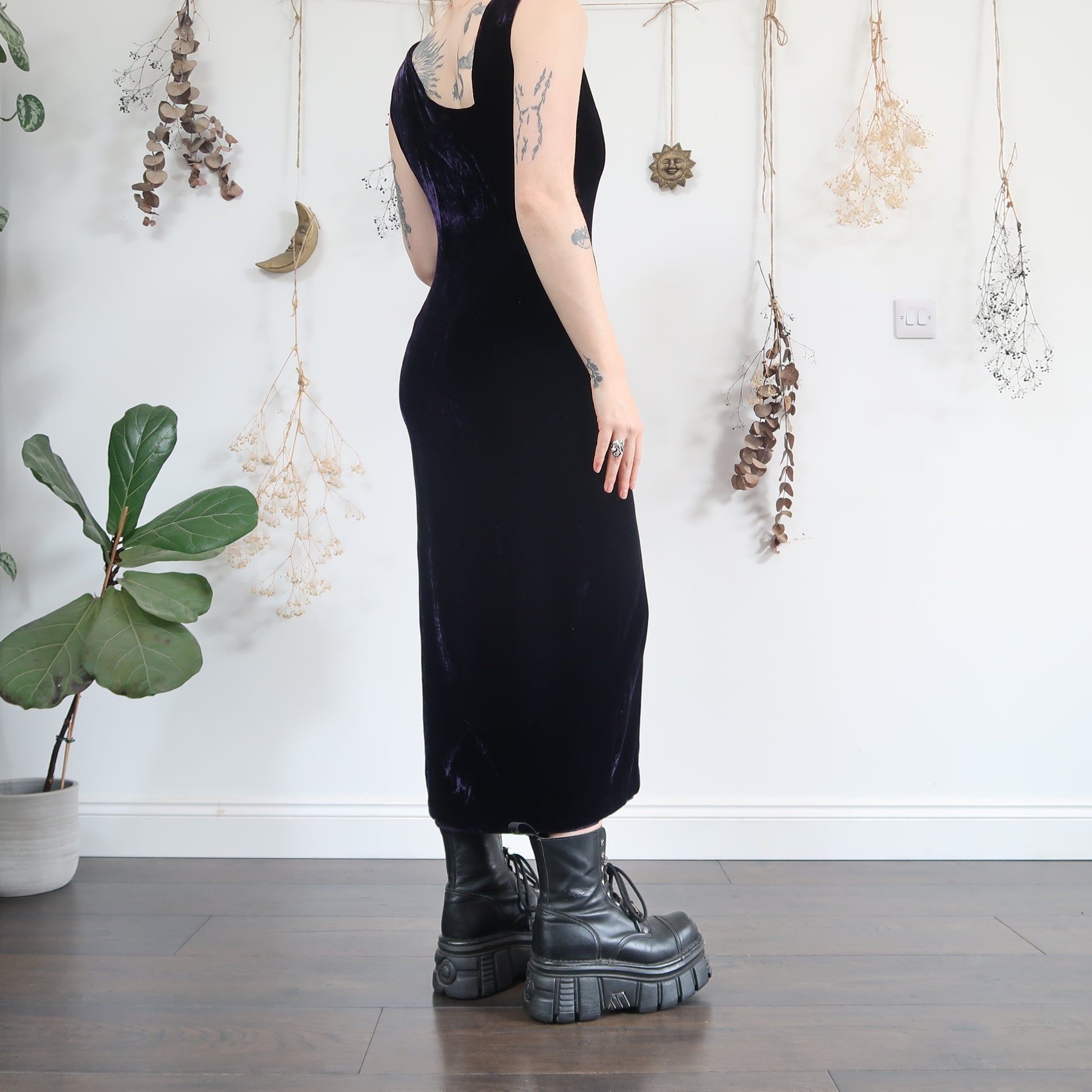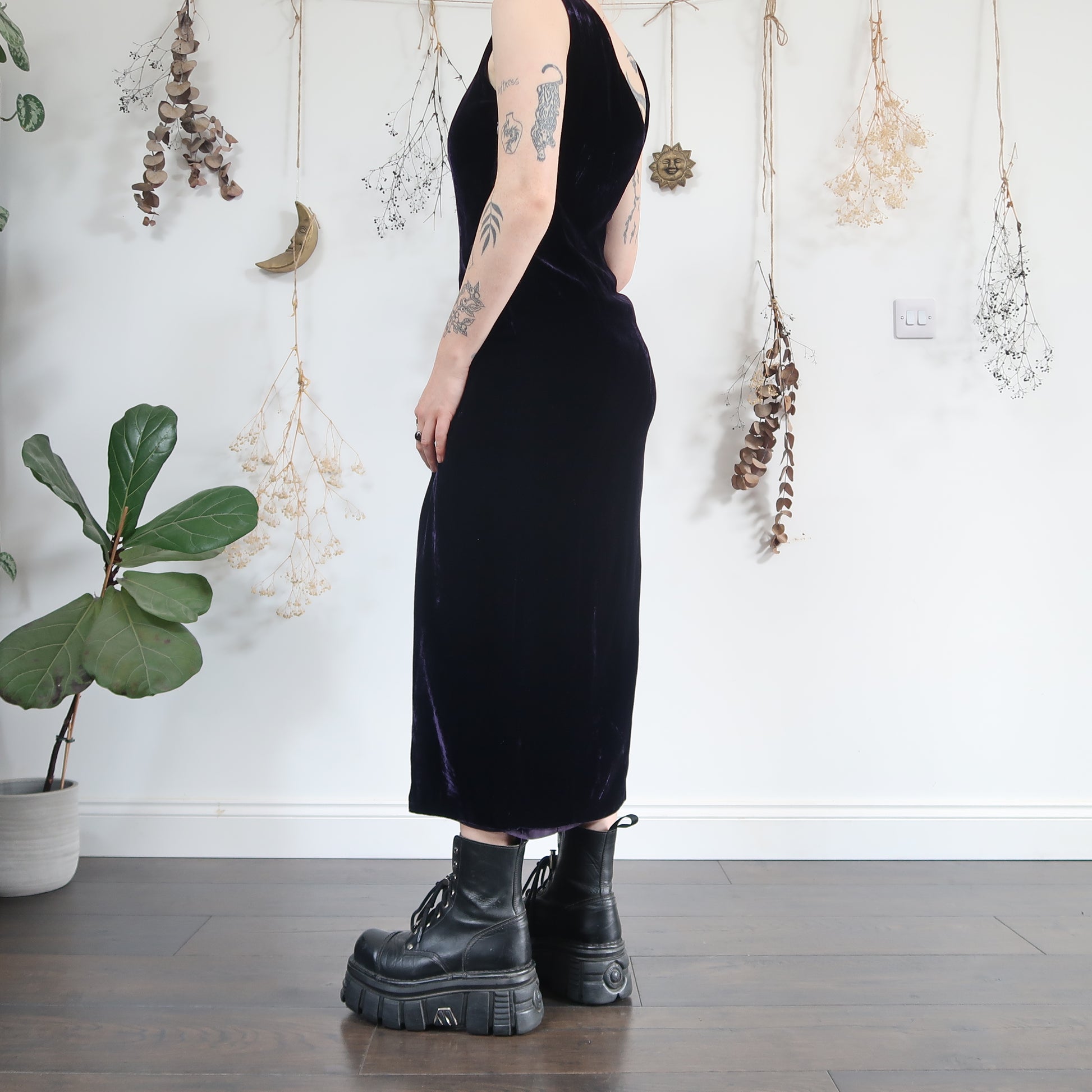 Vintage purple velvet dress with an asymmetric neckline and a slit to one side