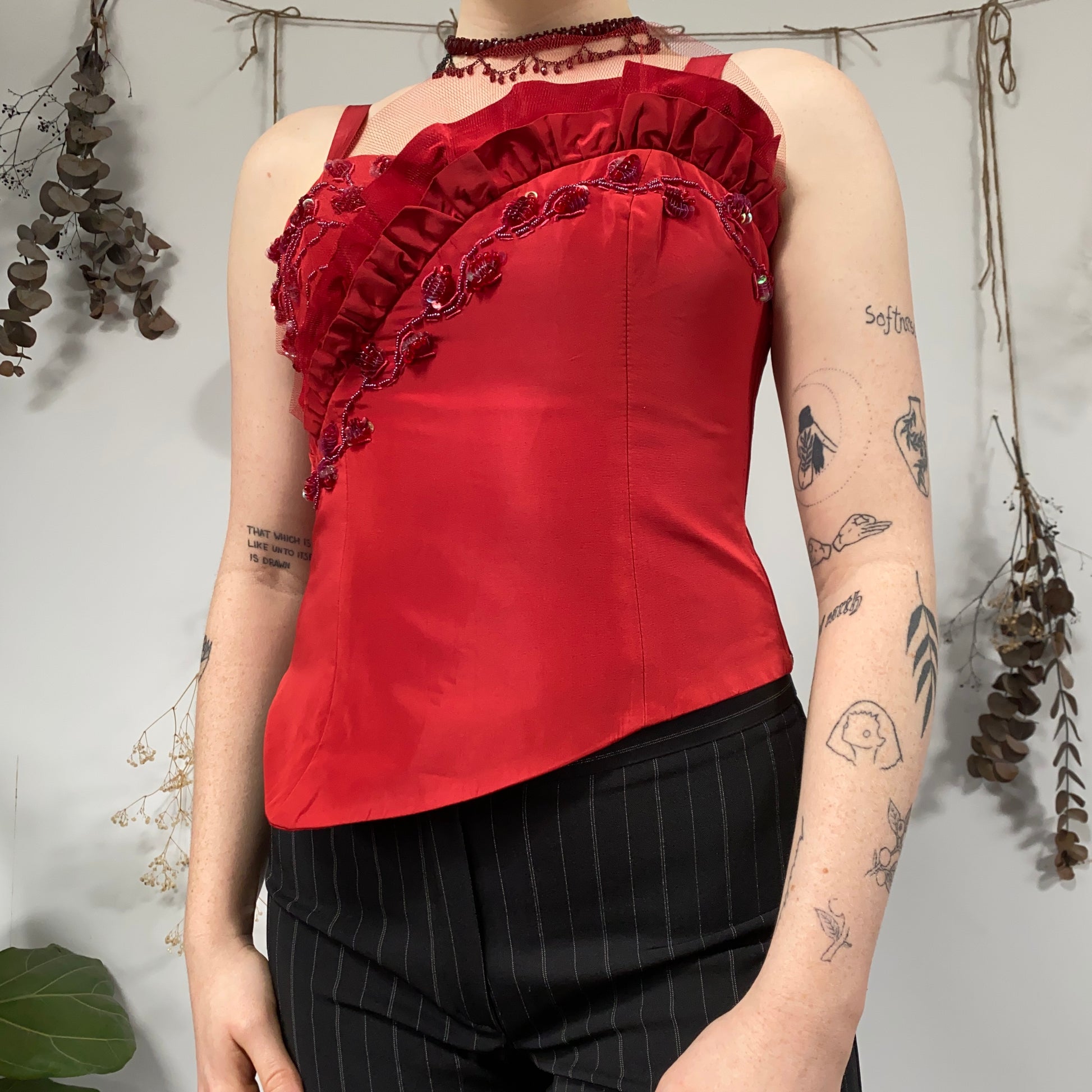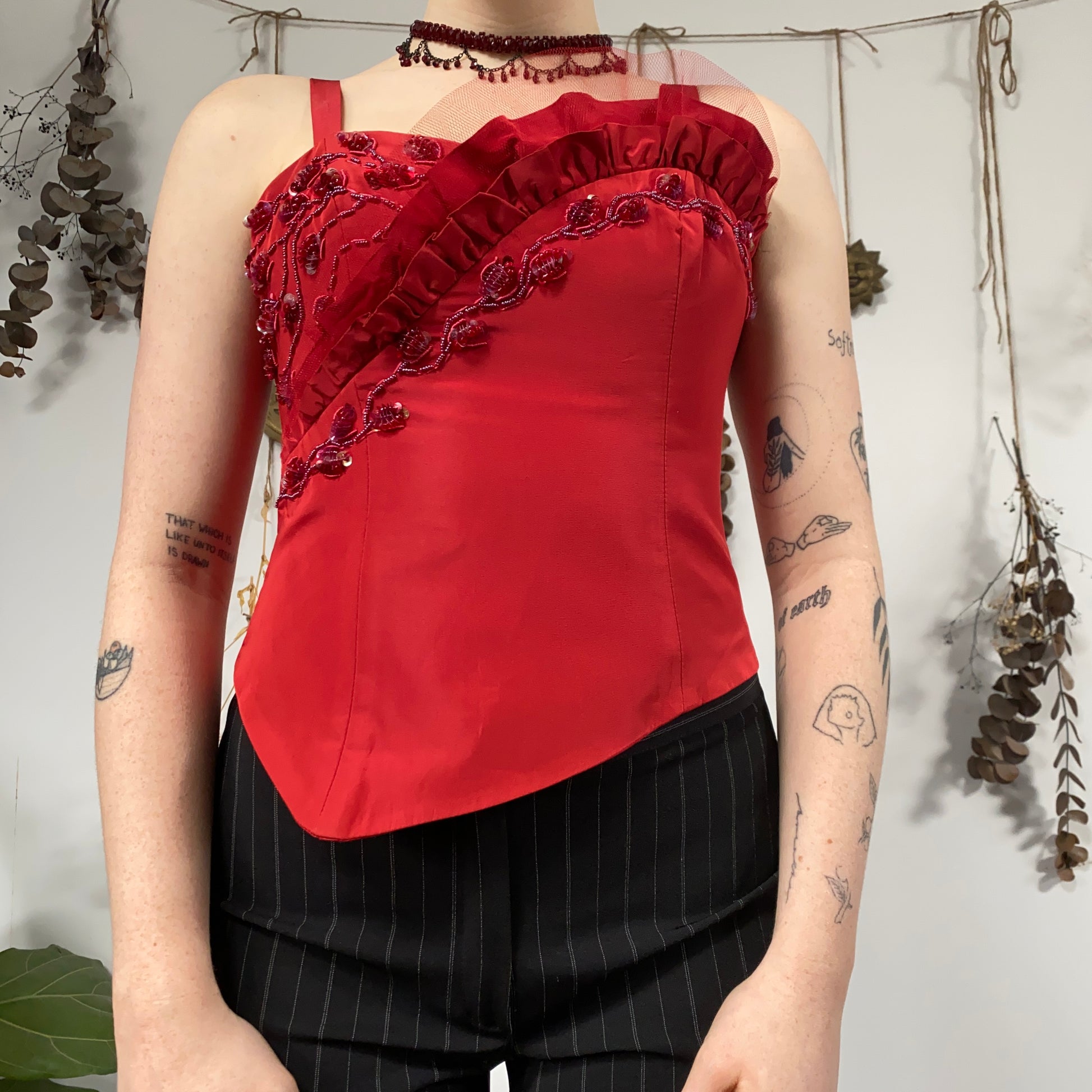 Vintage red asymmetric corset top with floral beading and a lace up back