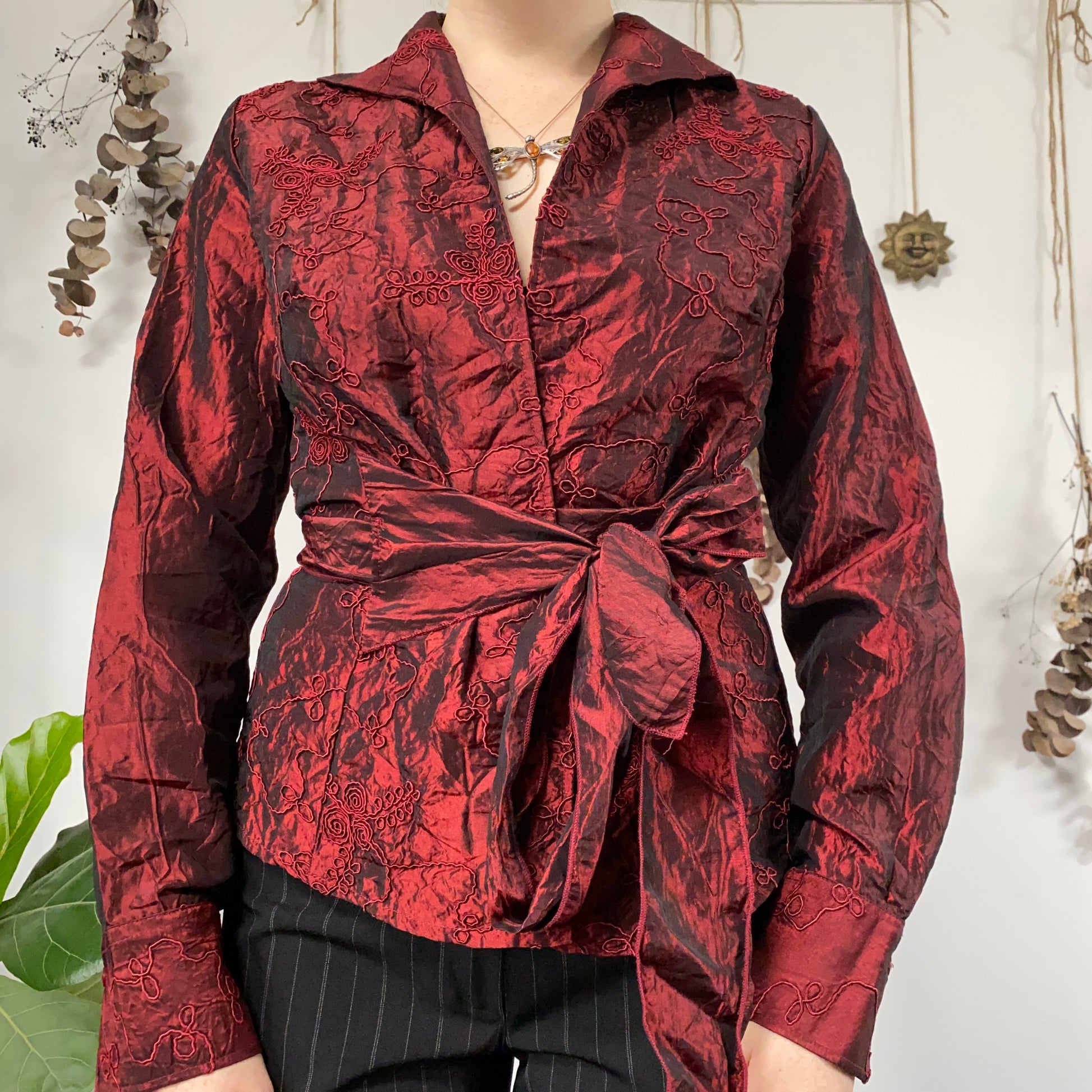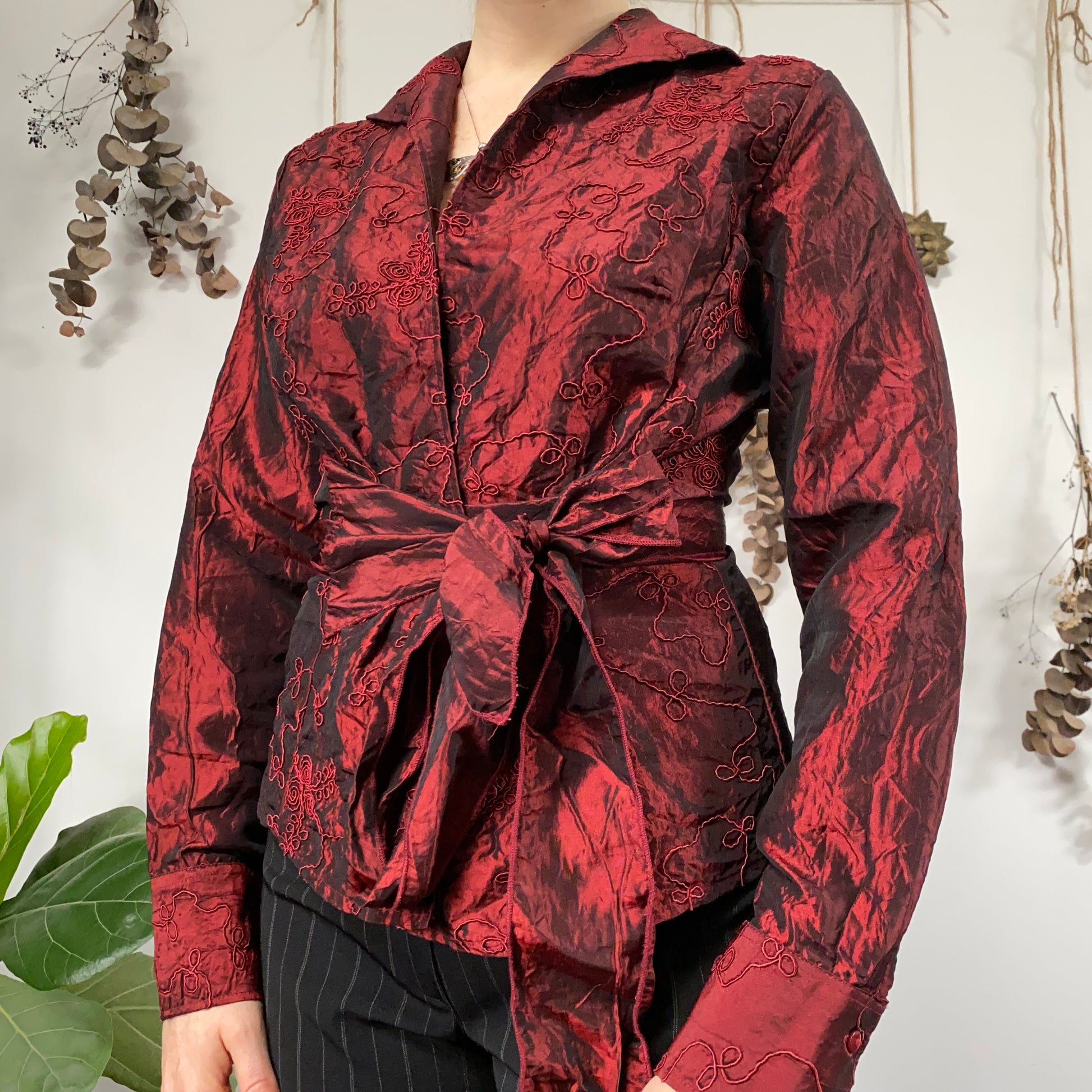 Vintage deep red iridescent tie up shirt with floral textured pattern