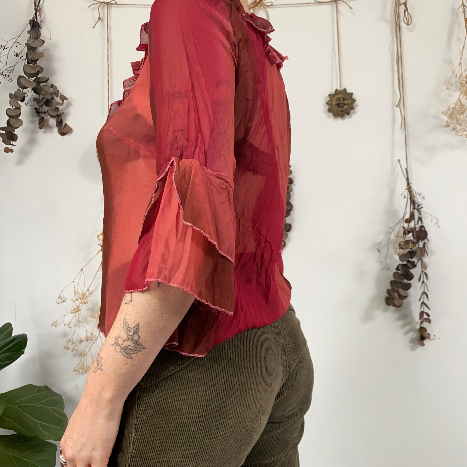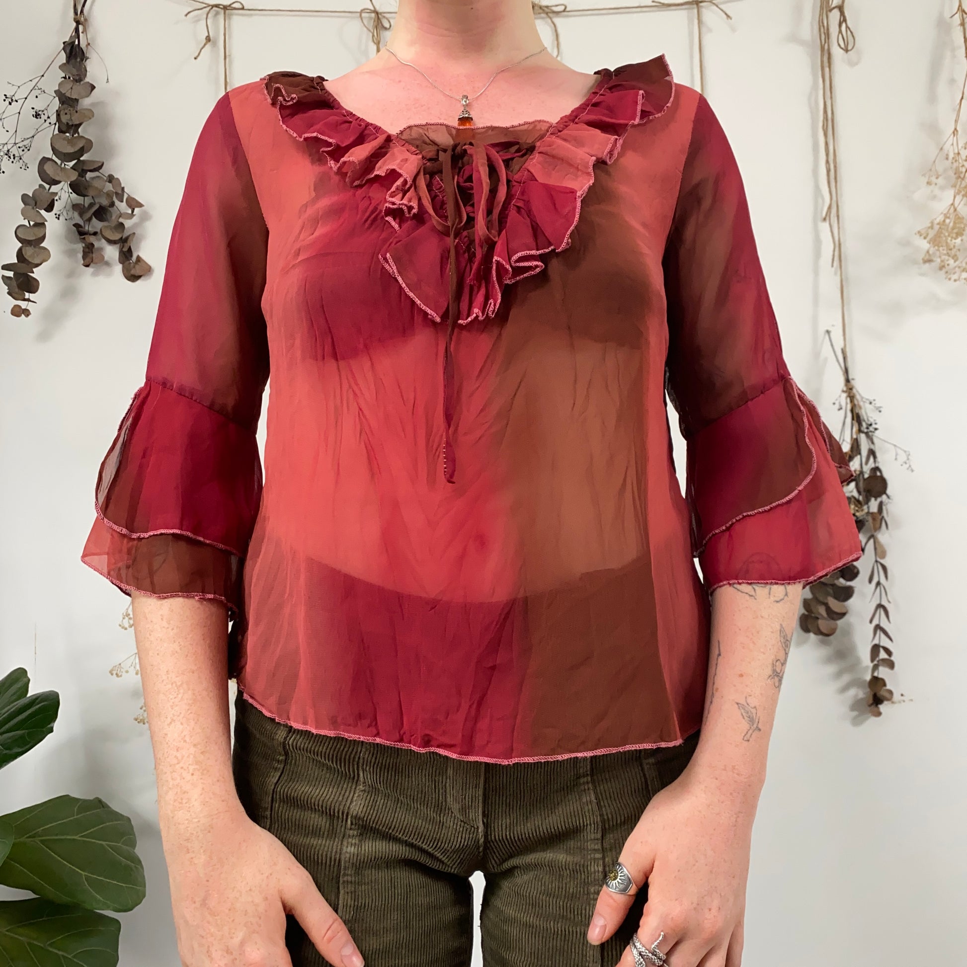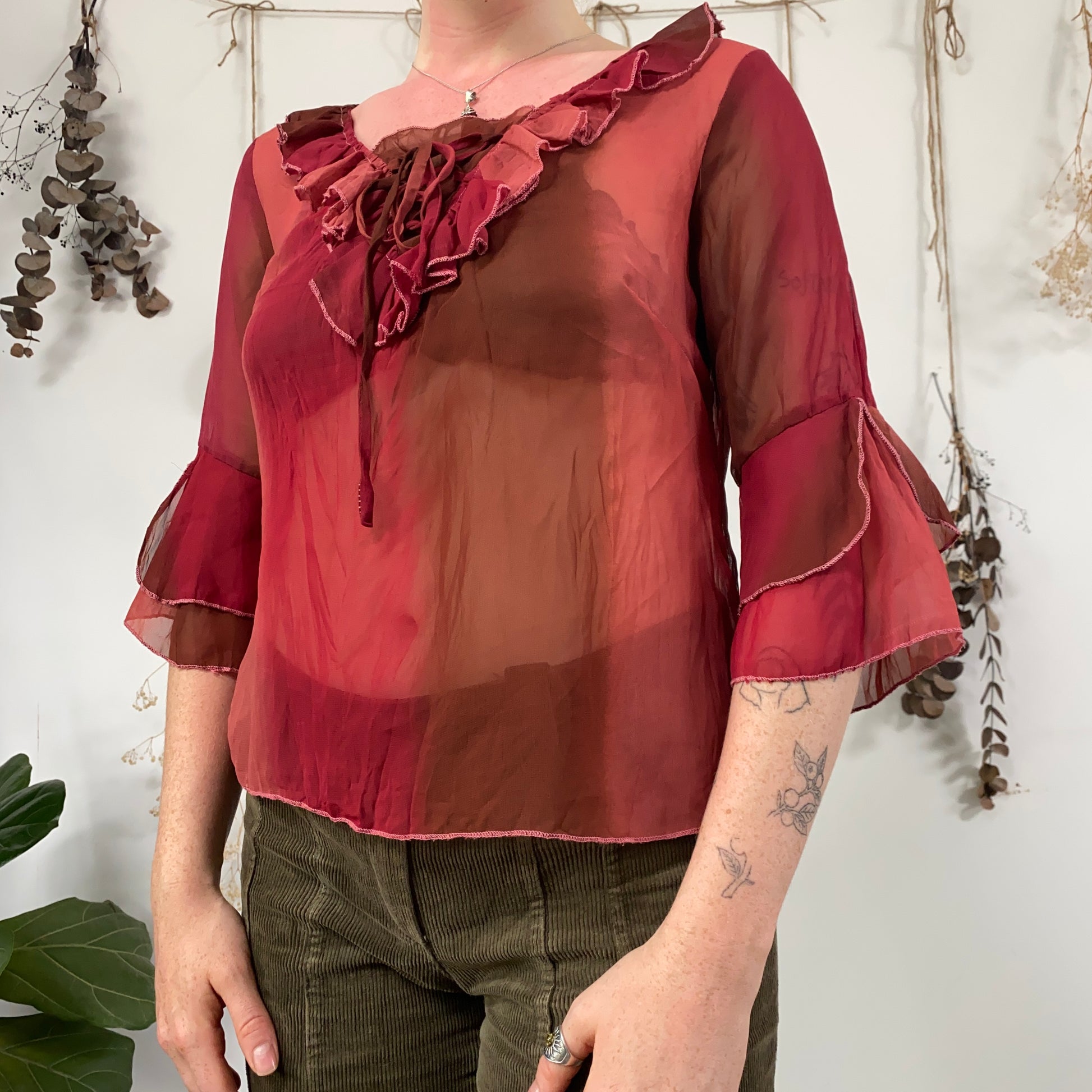 Vintage raspberry brown semi sheer ruffle blouse with flared sleeves