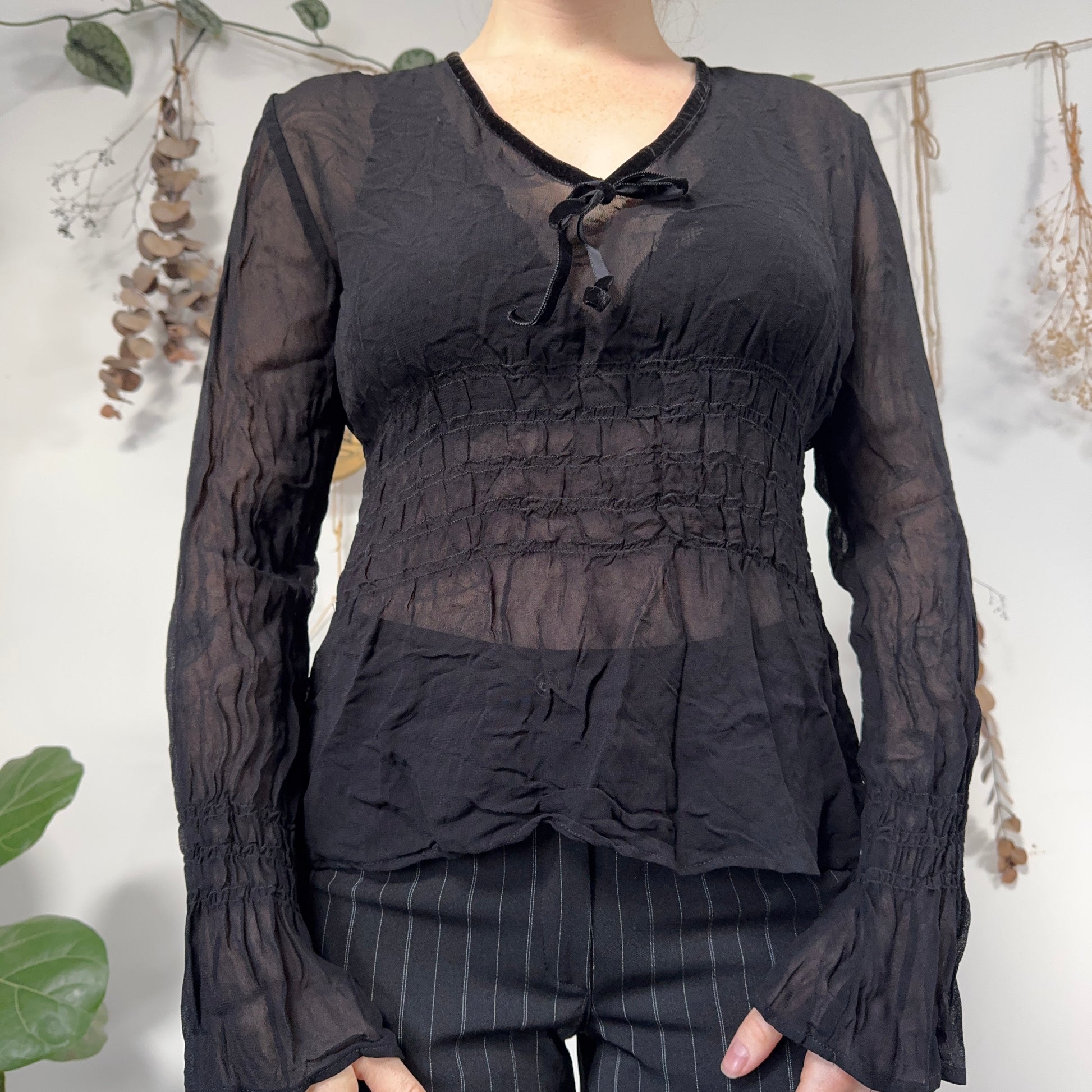 Vintage black sheer long sleeve top with flared sleeves, velvet ribbon trim and elasticated underbust and cuffs