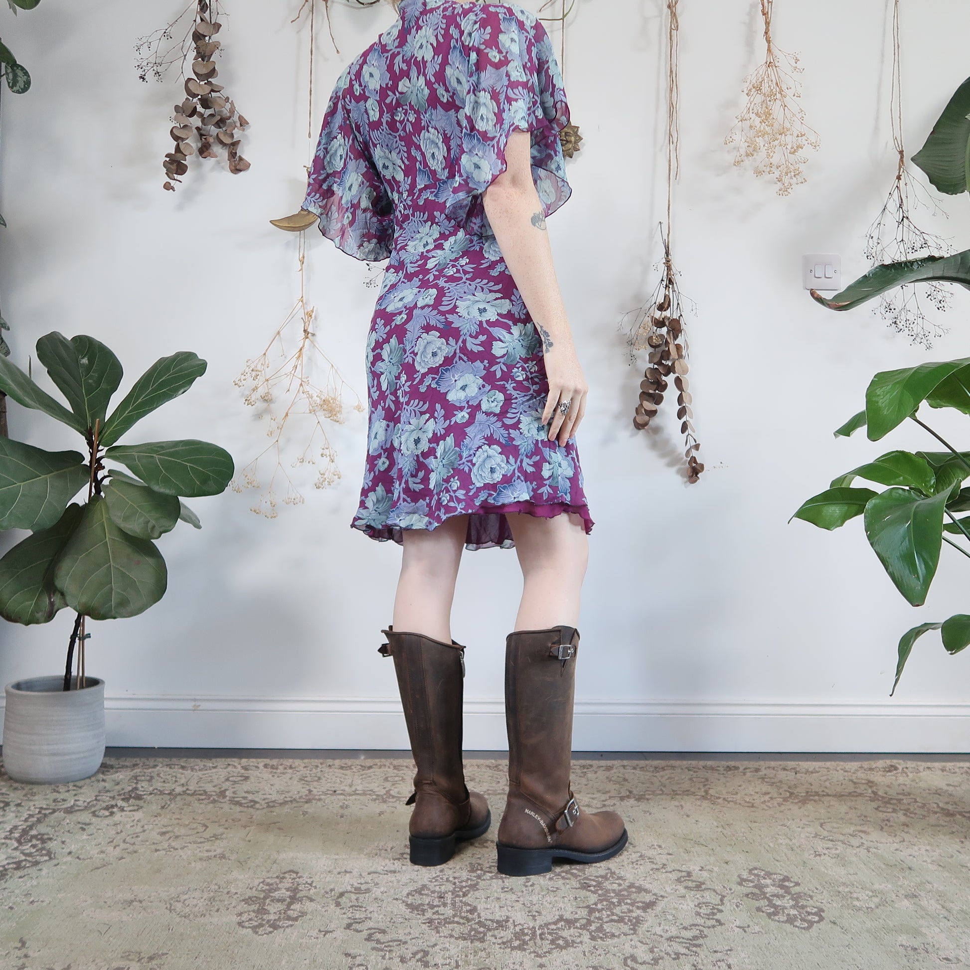 Vintage purple blue silk floral dress with gorgeous floaty sleeves