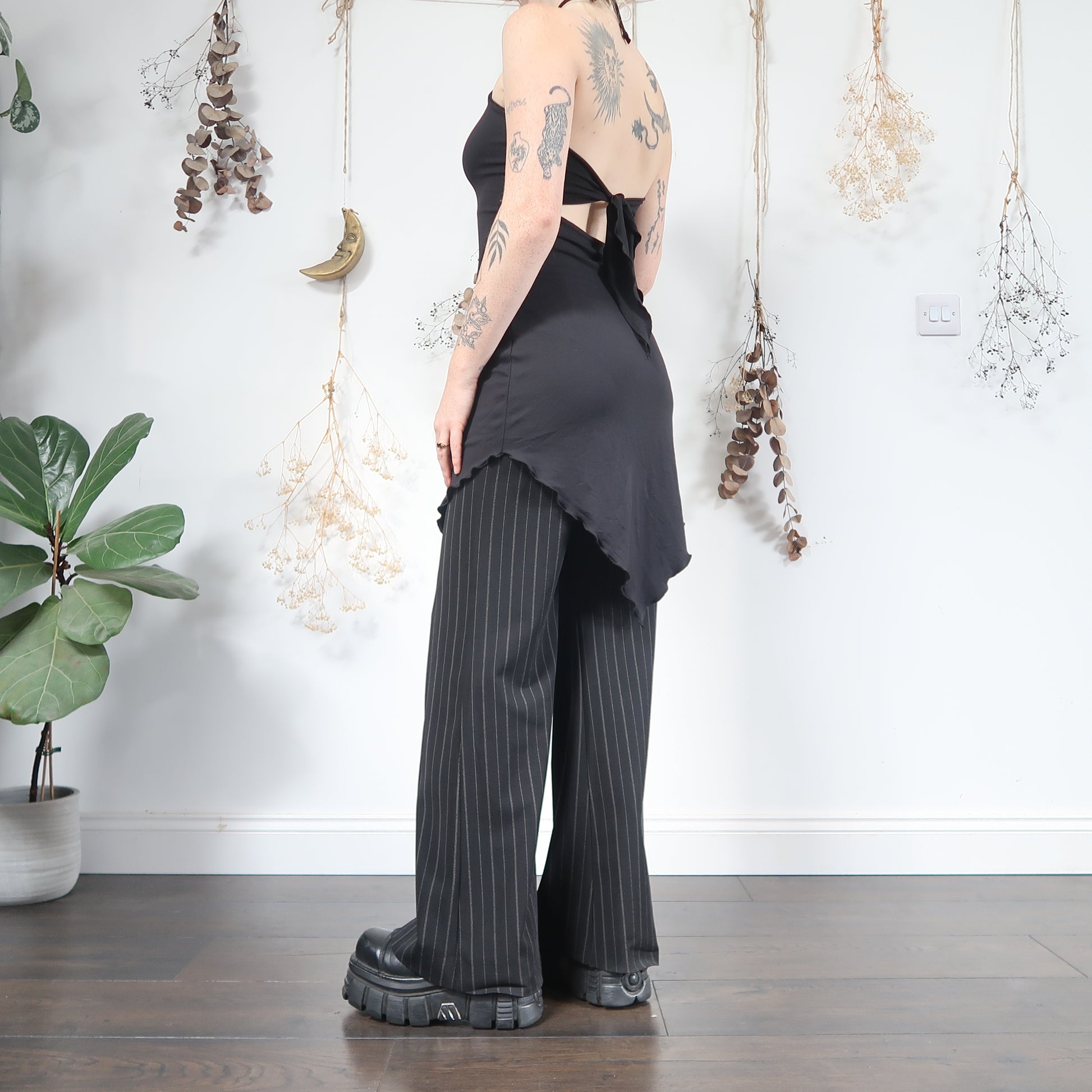 Vintage black soft slinky dress. Halter neck with a keyhole detail, tie at the back and hankercheif hem
