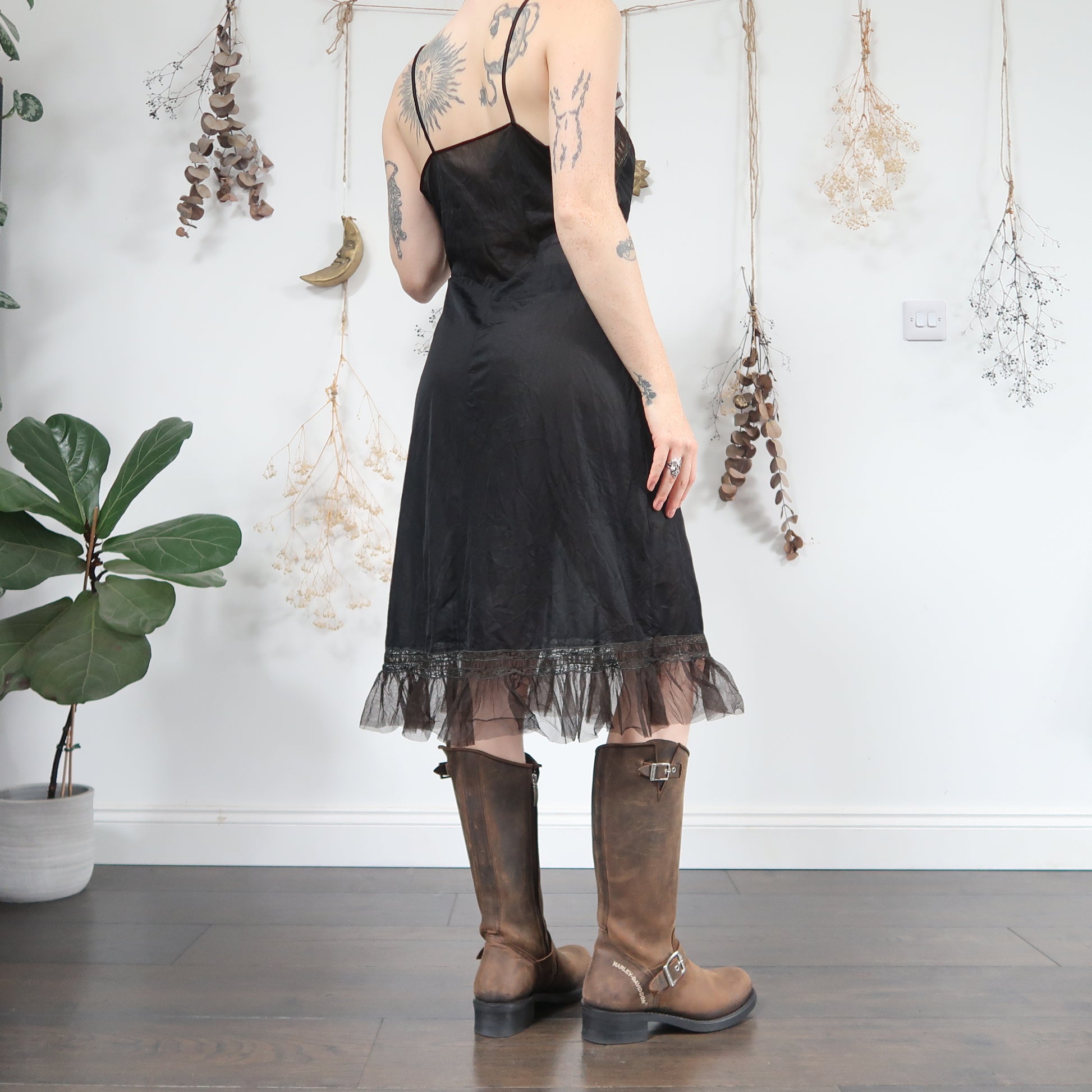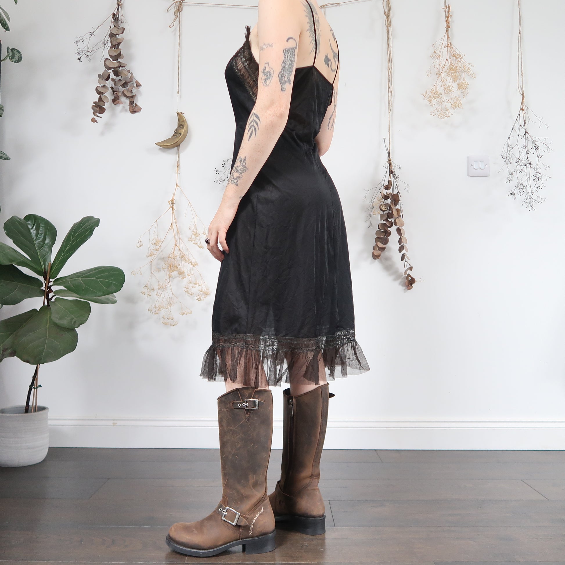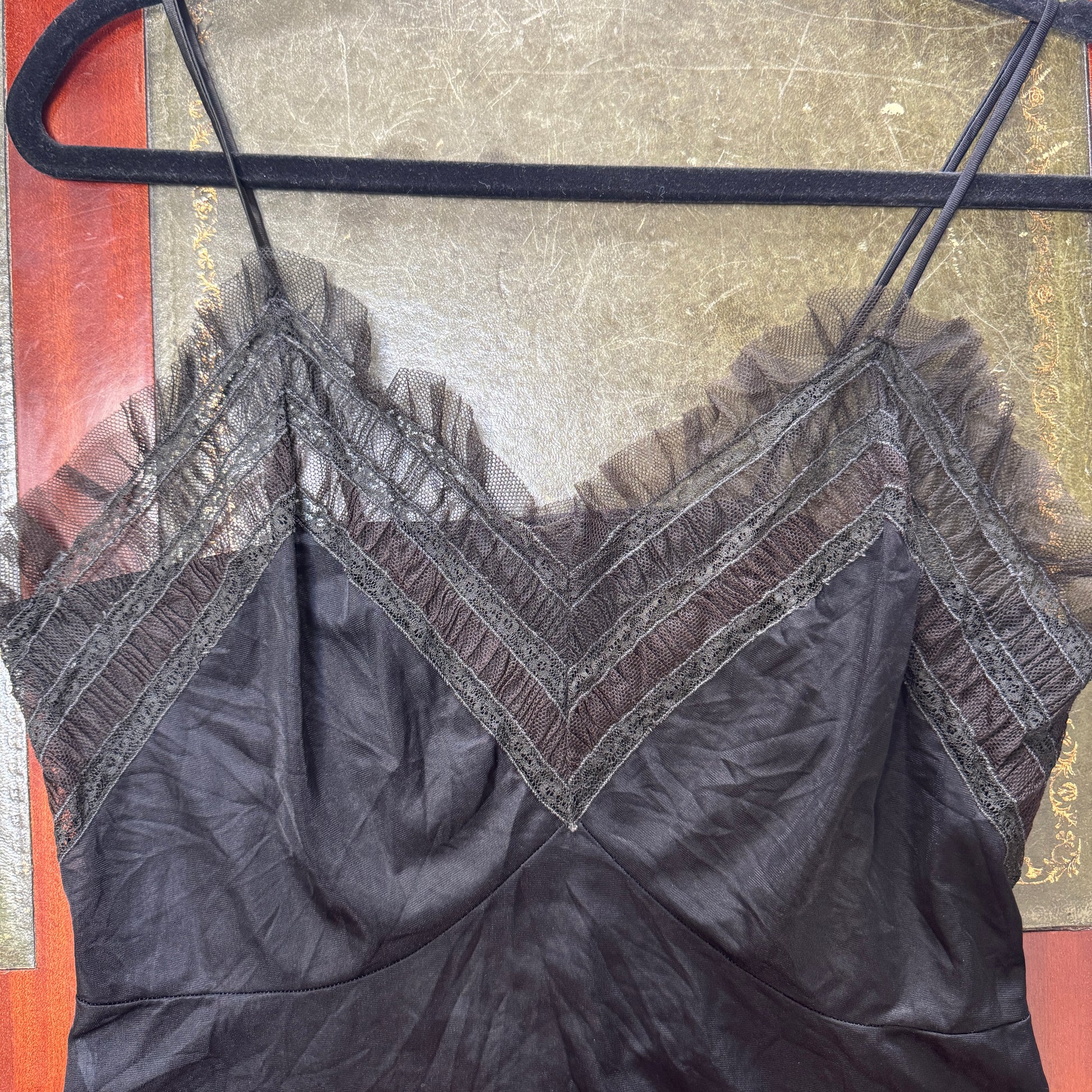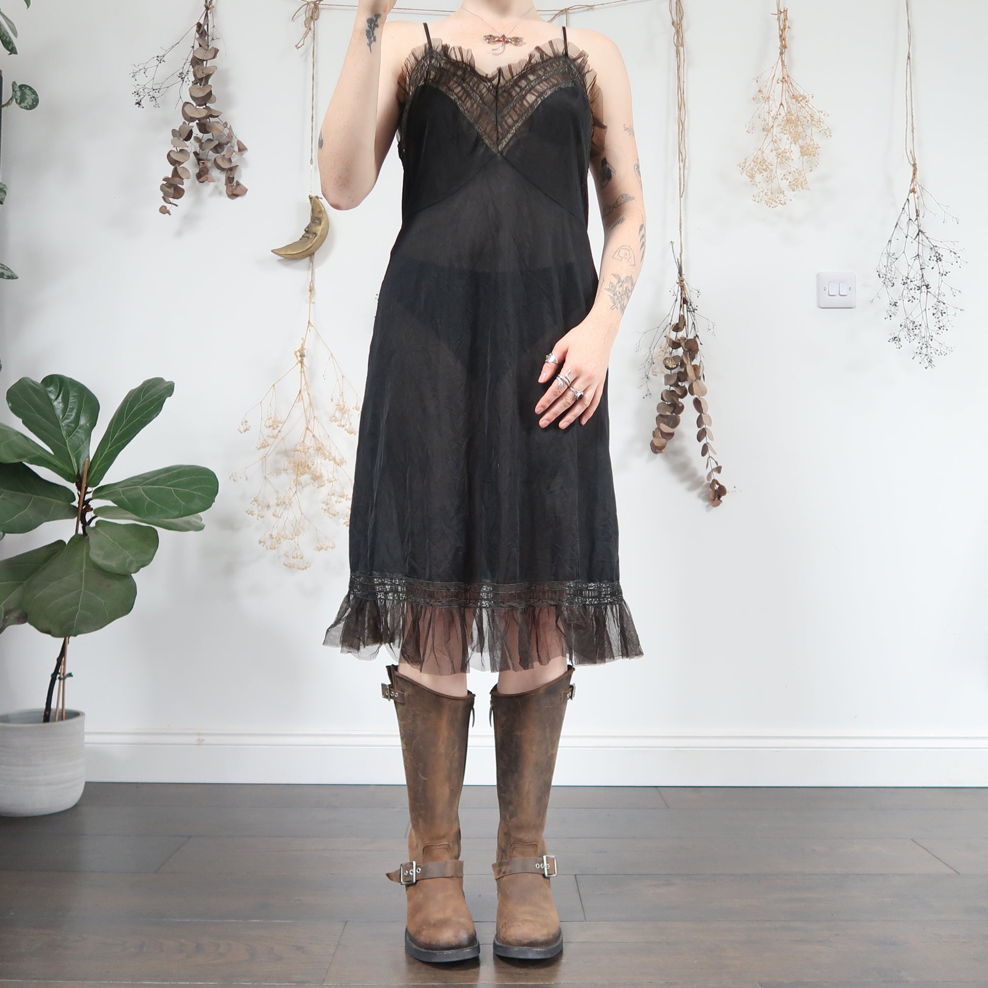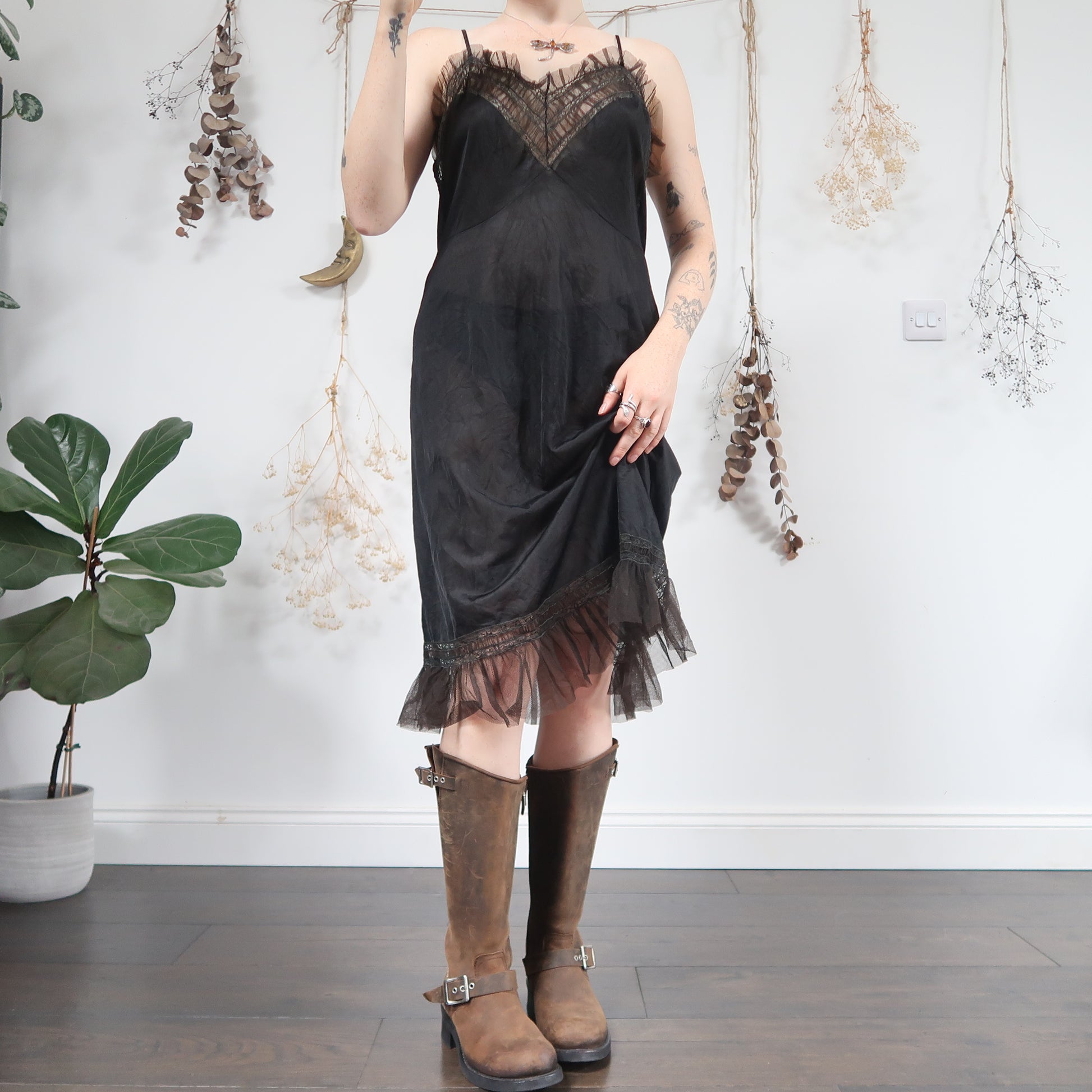 Vintage grungey black midi slip dress with gorgeous brown and and khaki mesh lace ruffle trims