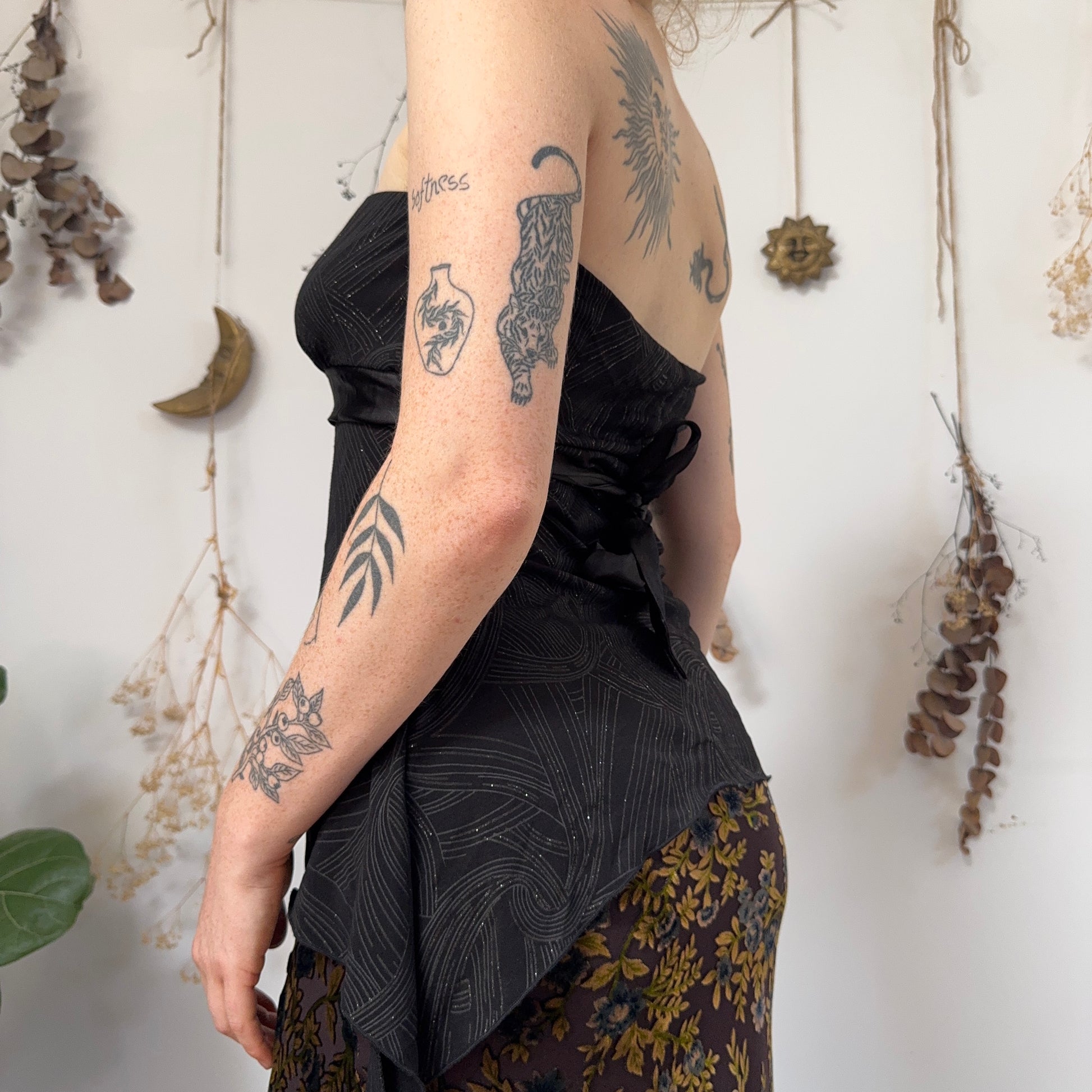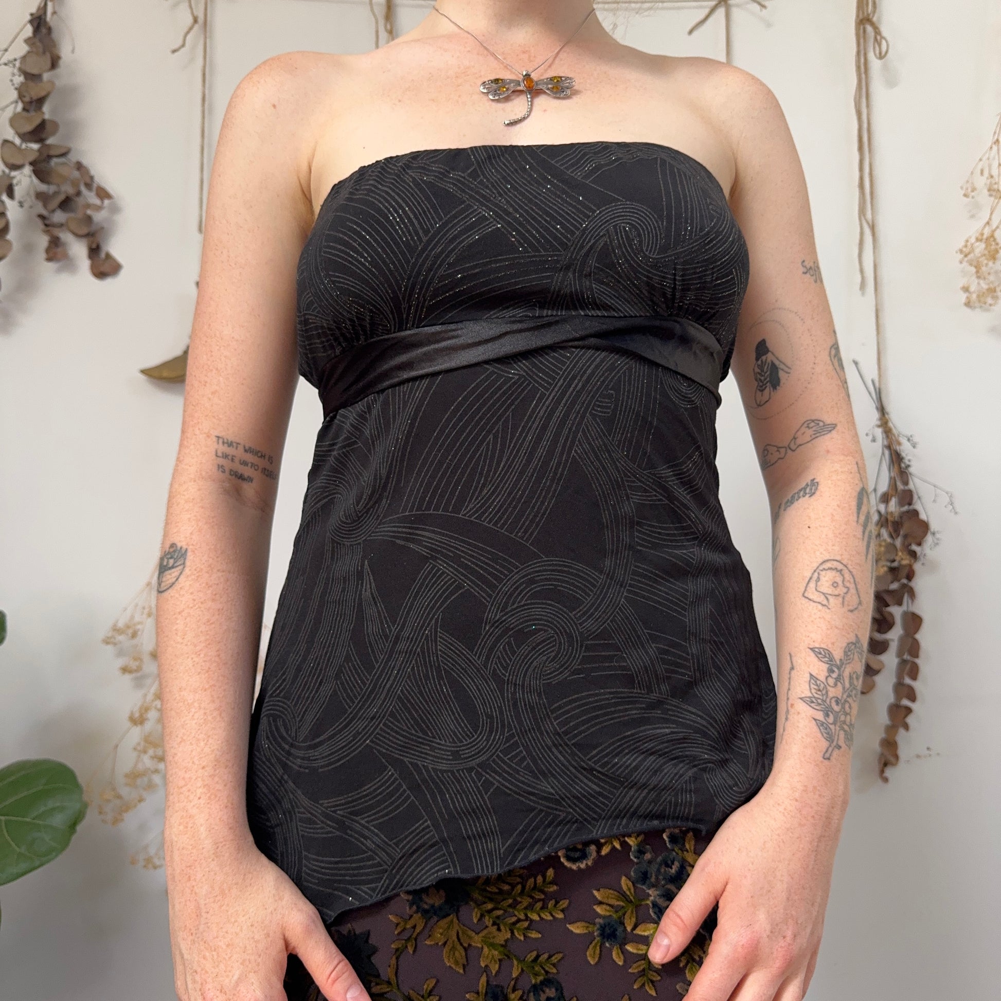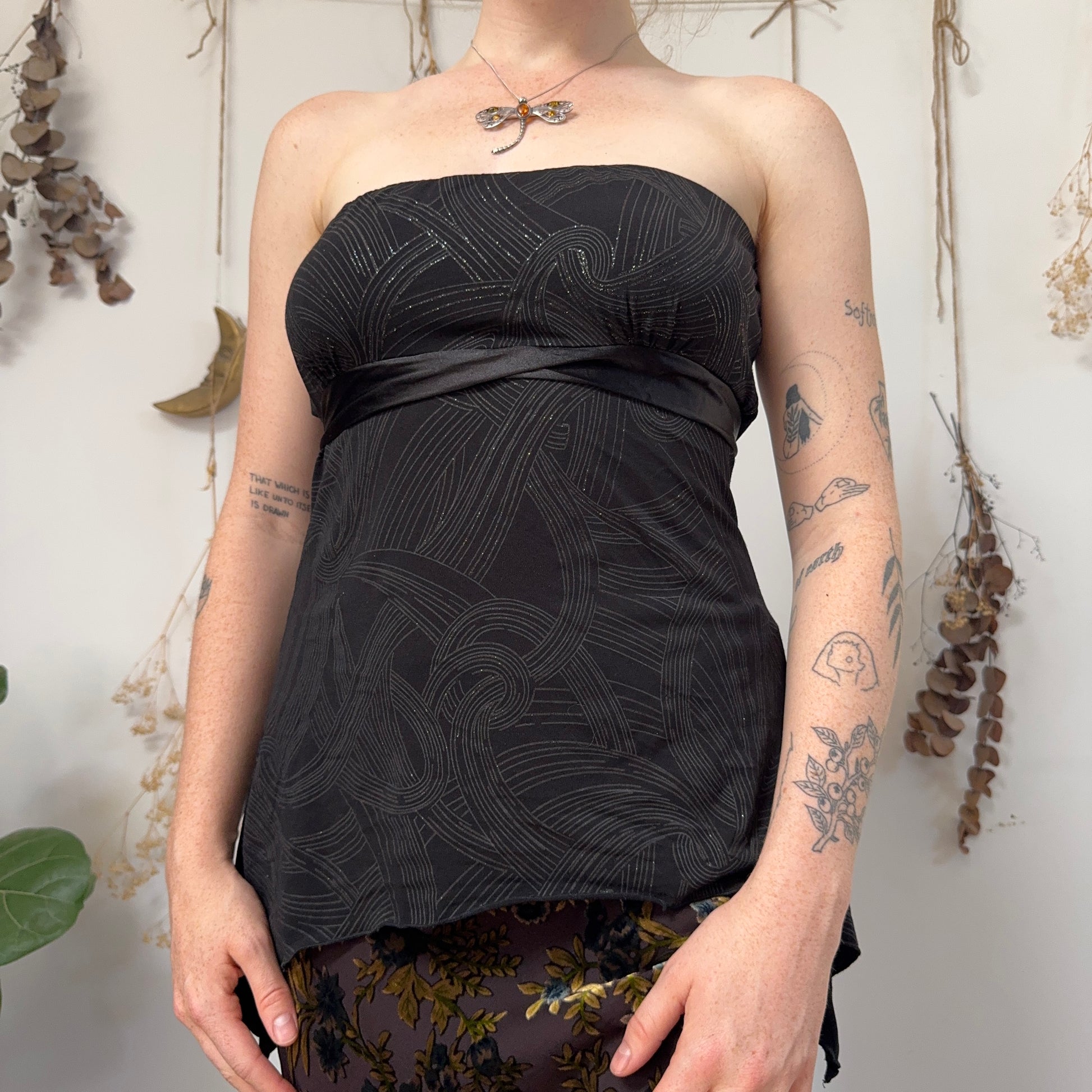 Vintage black strapless top with an asymmetric hem, ribbon ties at the back