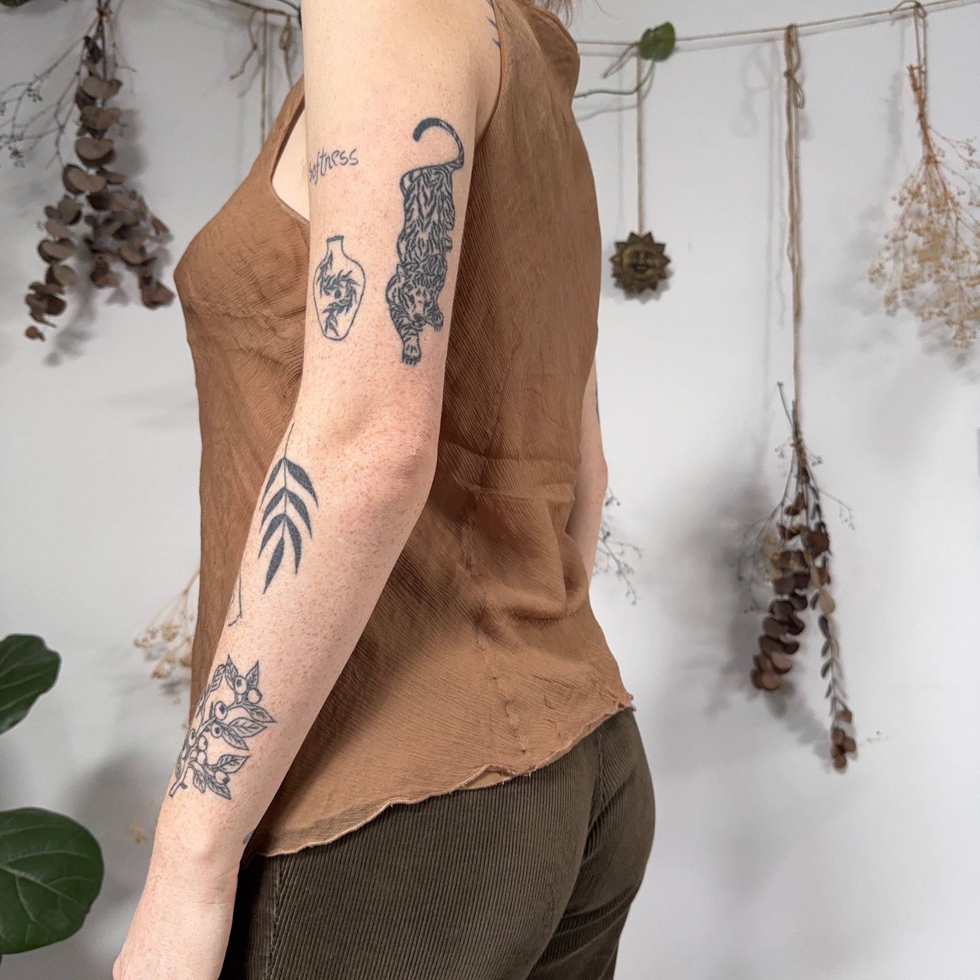 Vintage tan flowy silk tank top with embroidery and tie detail