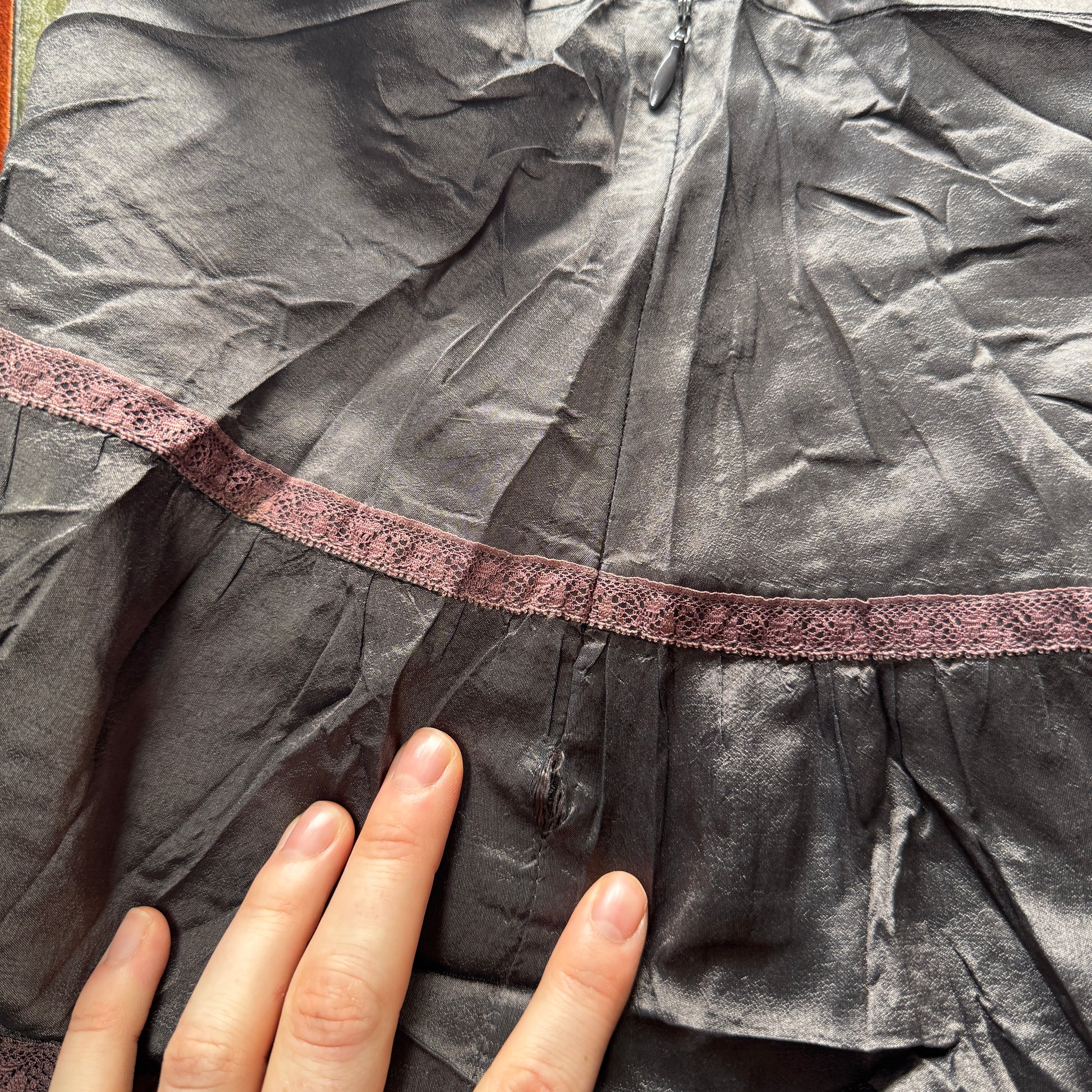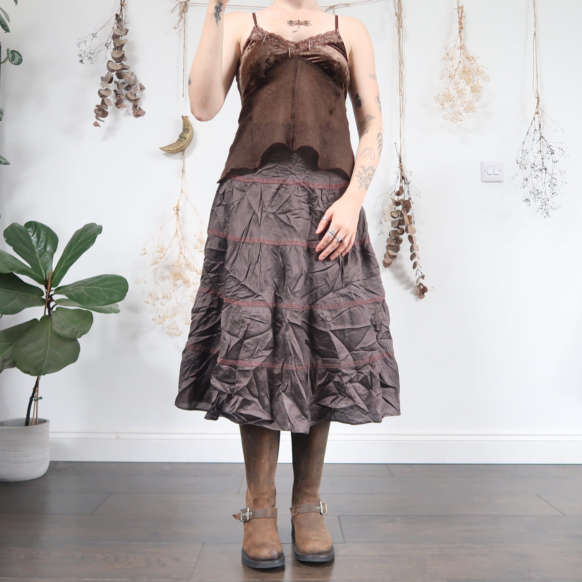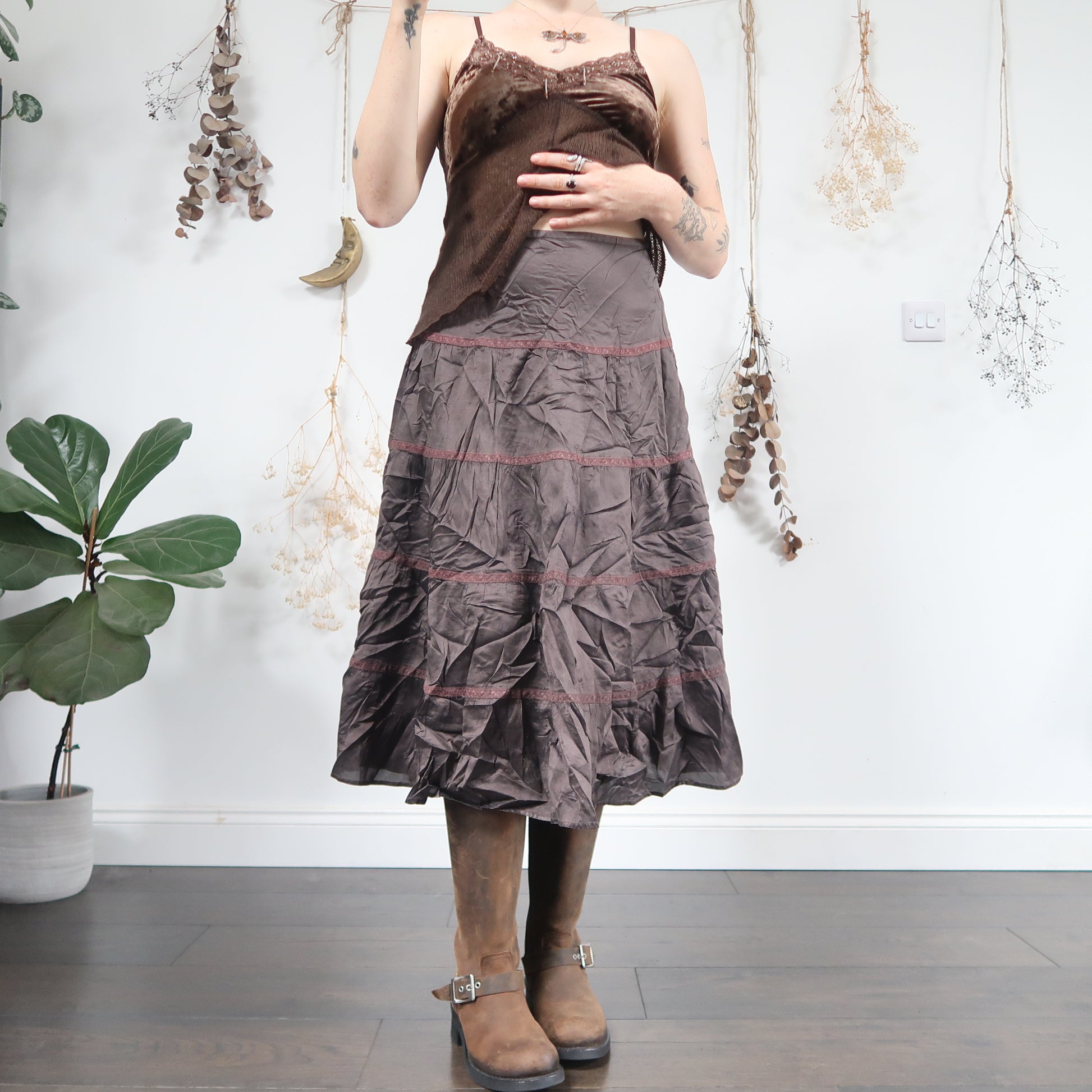 Vintage brown/grey lightweight midi skirt with dusky pink/burgundy lace trims