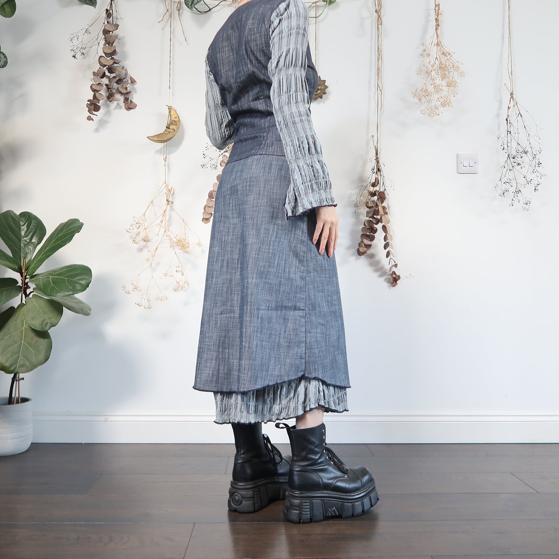 Vintage stretch denim blouse and skirt with lace up detail and flared sleeves