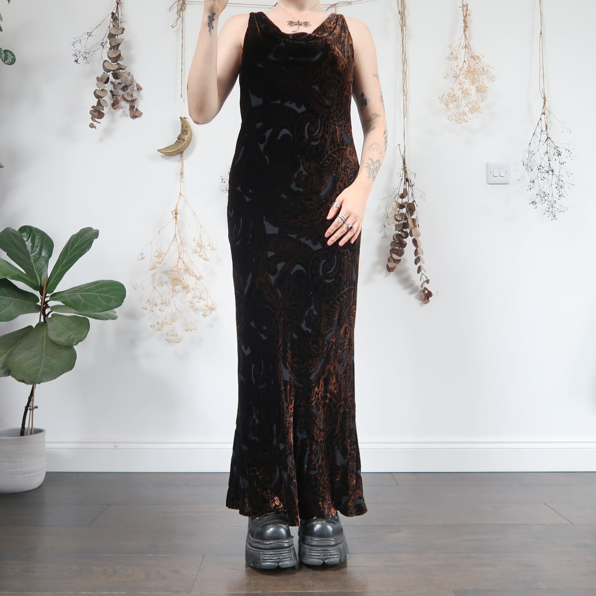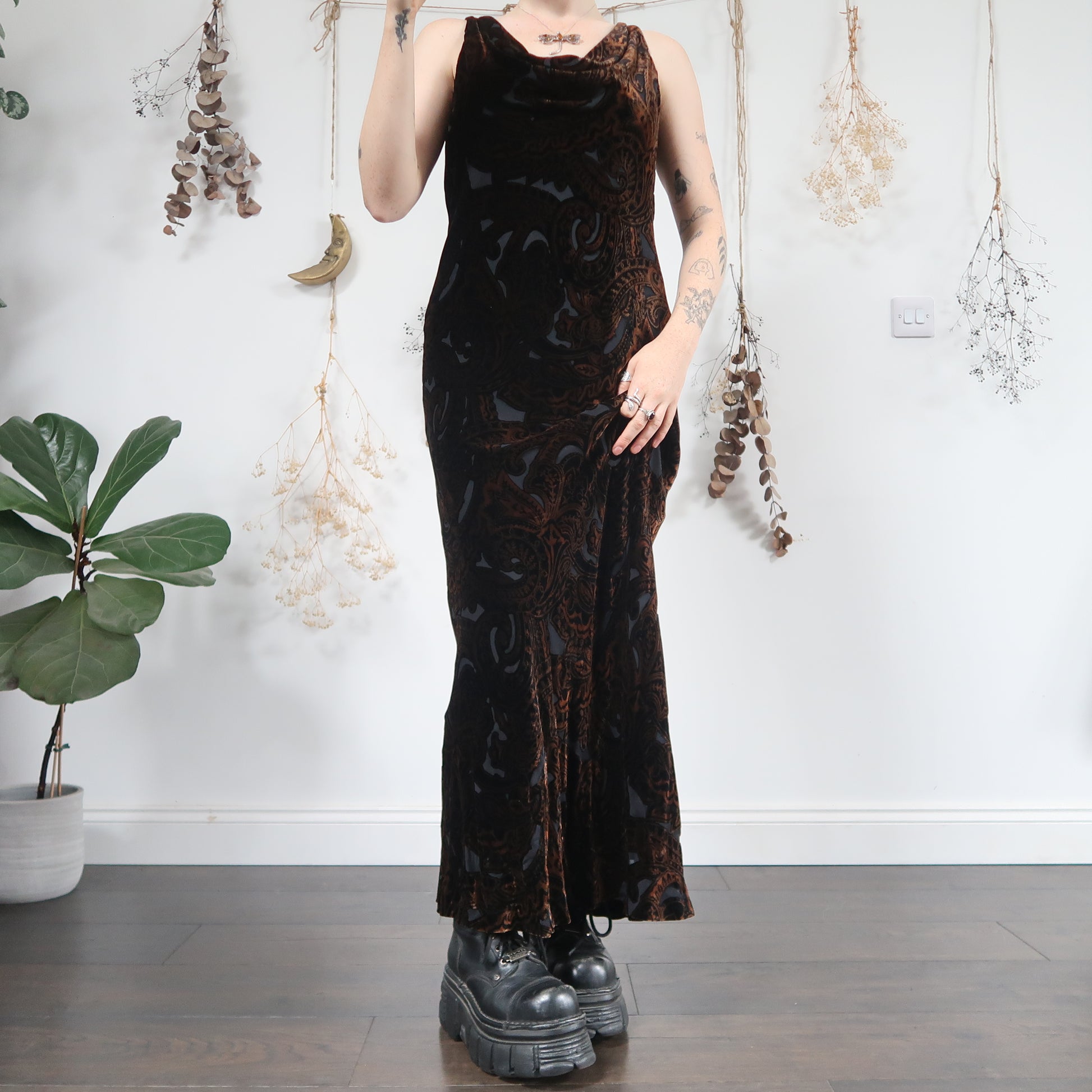 Vintage black and bronze velvet embossed paisley dress with a cowl neck
