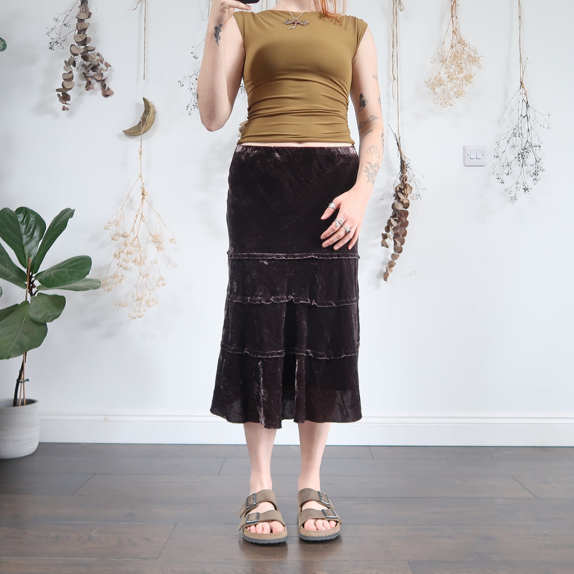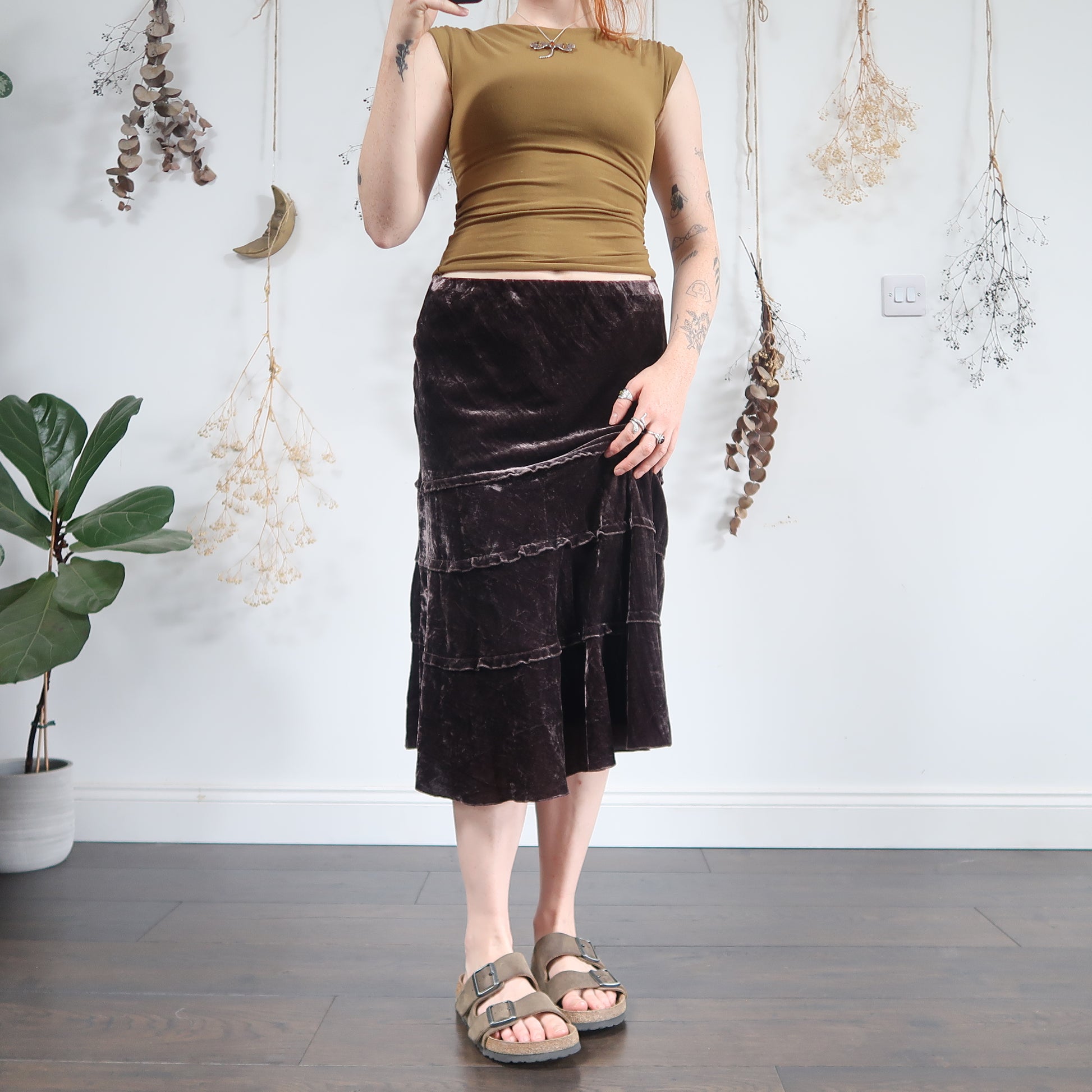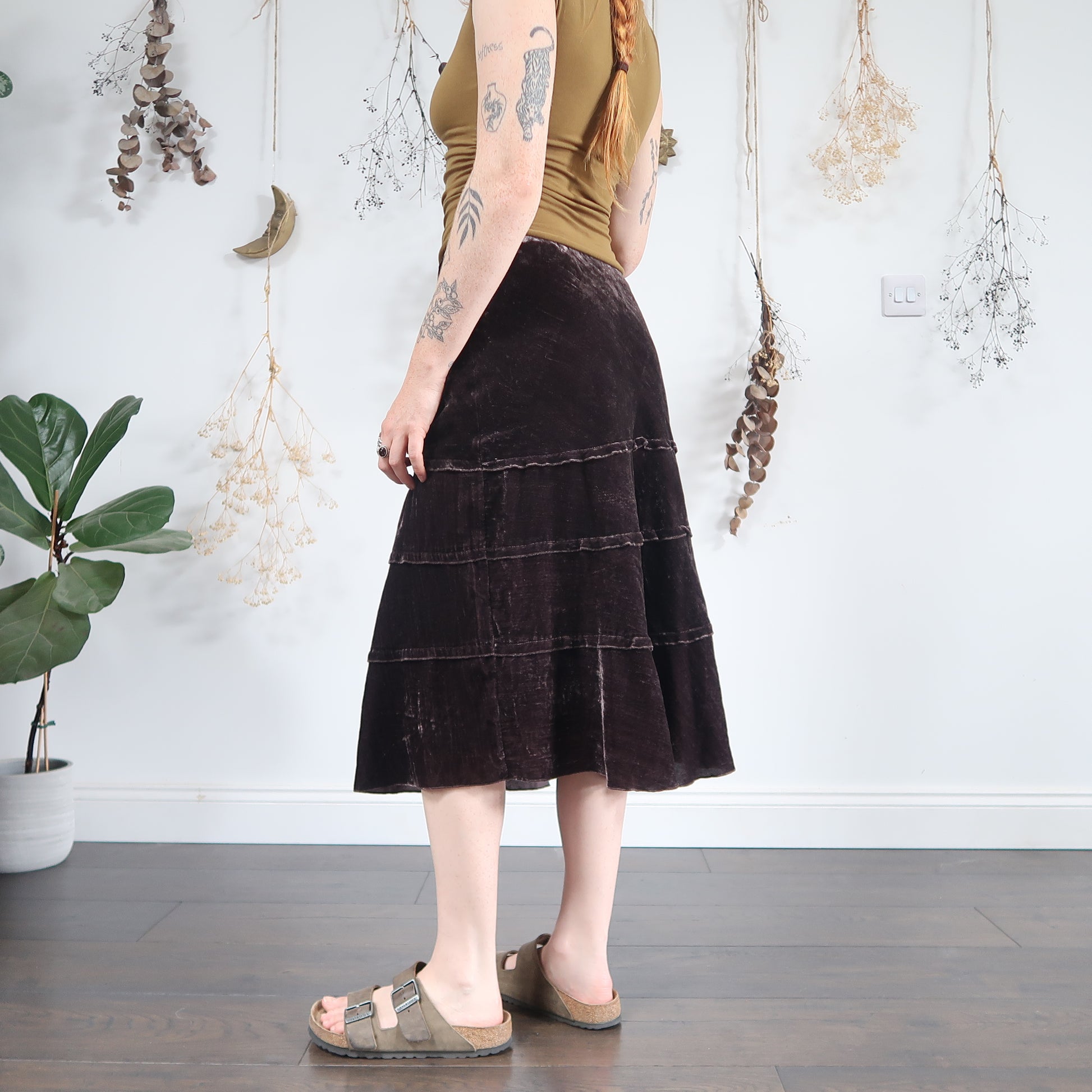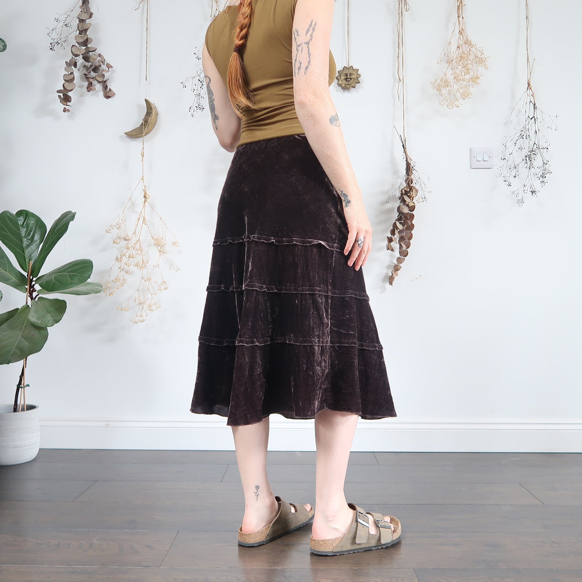 Vintage cool toned brown velvet tiered midi skirt