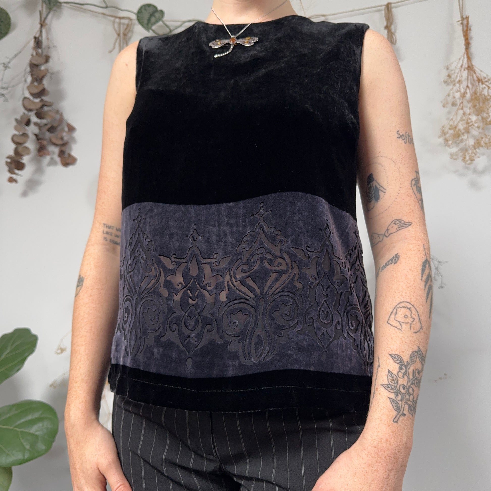 Vintage black velvet tank top with a sheer patterned burnout grey velvet block hem