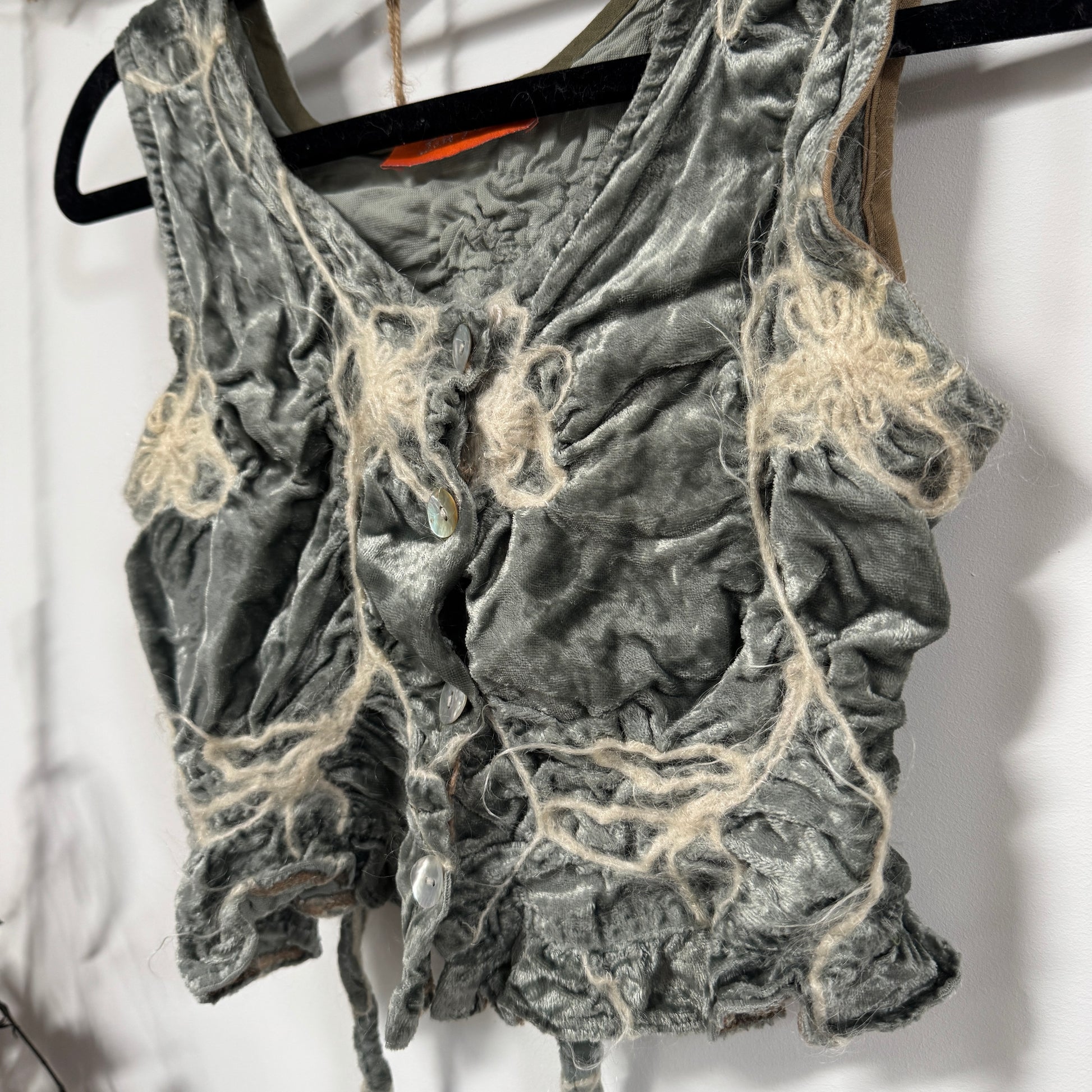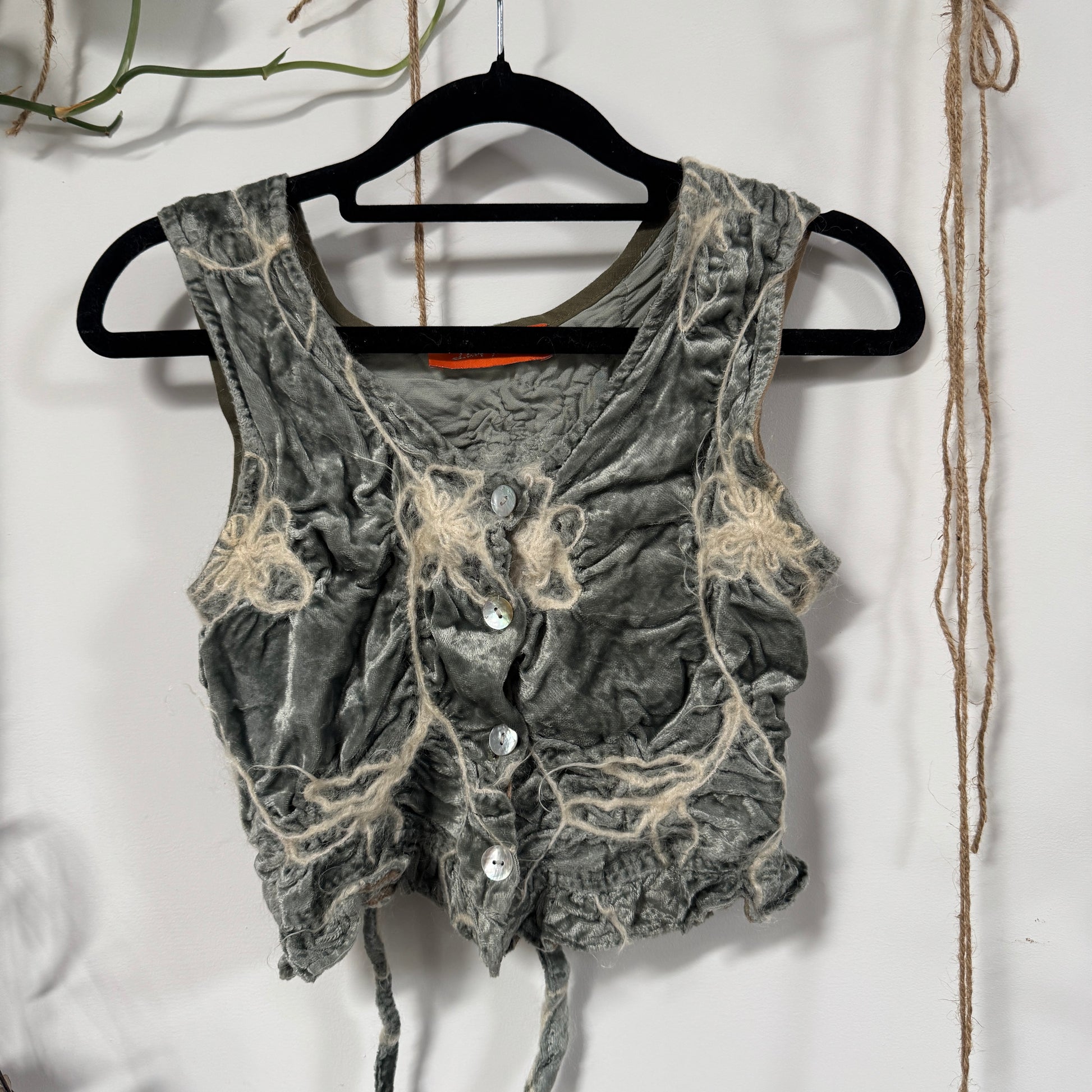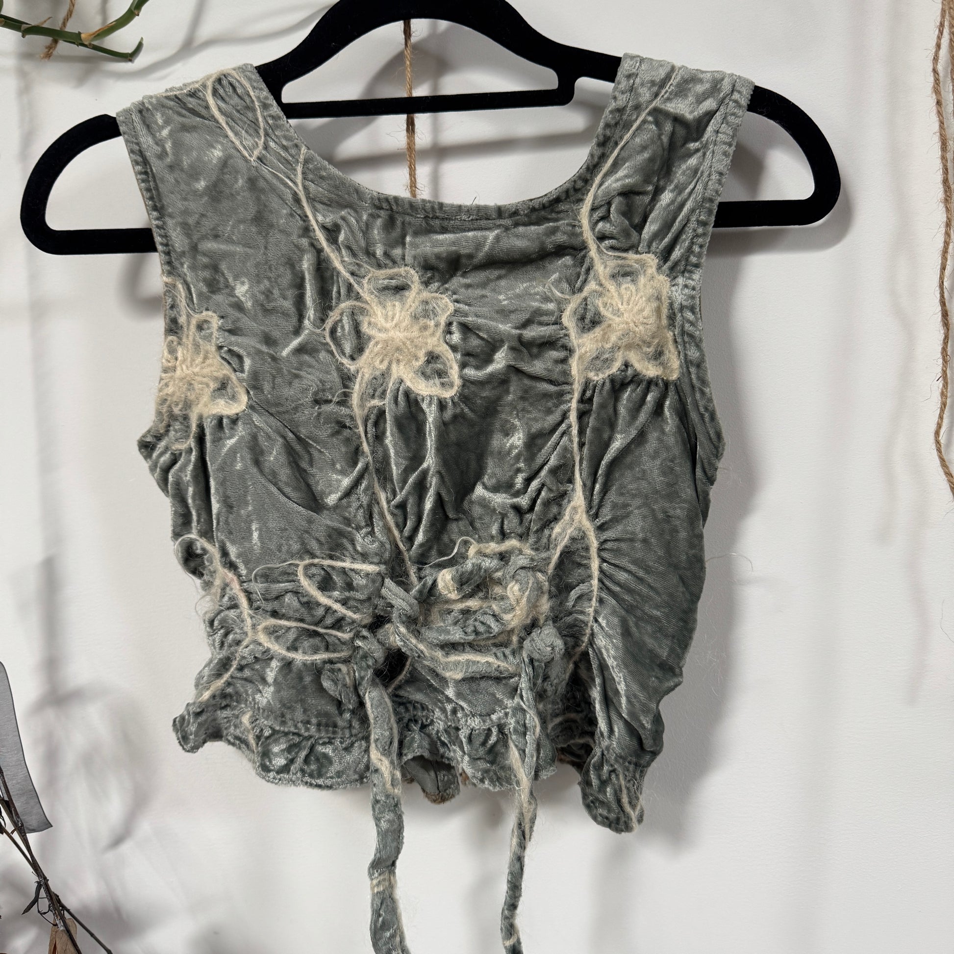 Vintage icey blue velvet button down tank top/waistcoat with gorgeous floral detail and a lace up back. So special, I've never found anything like it