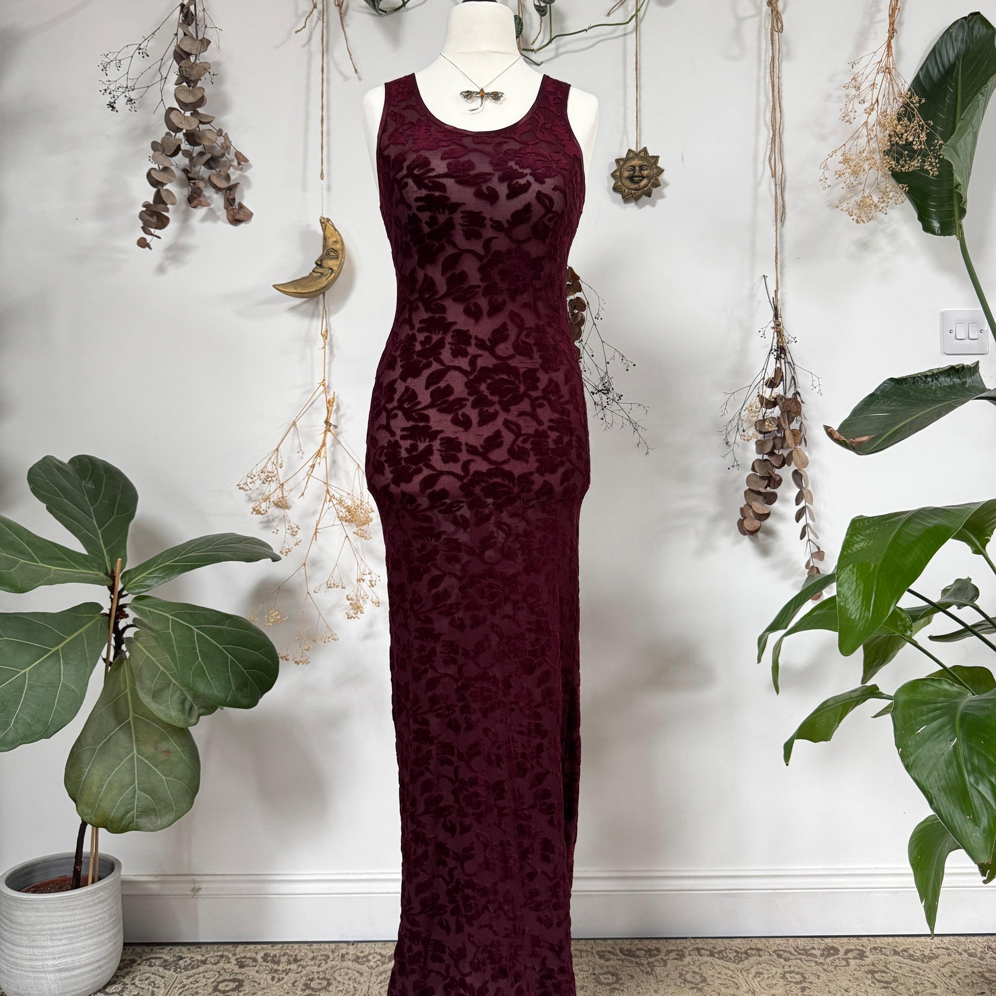 Vintage 90s wine red maxi dress, semi sheer with floral velvet pattern and ribbon trim