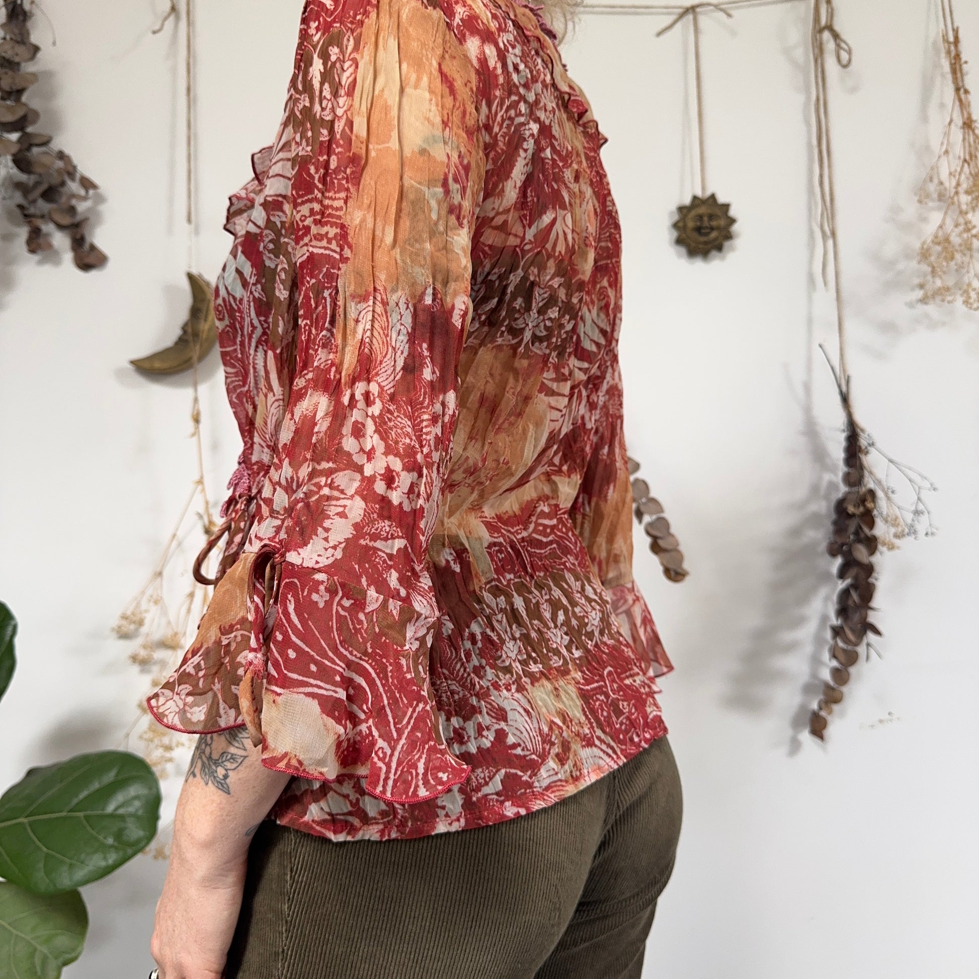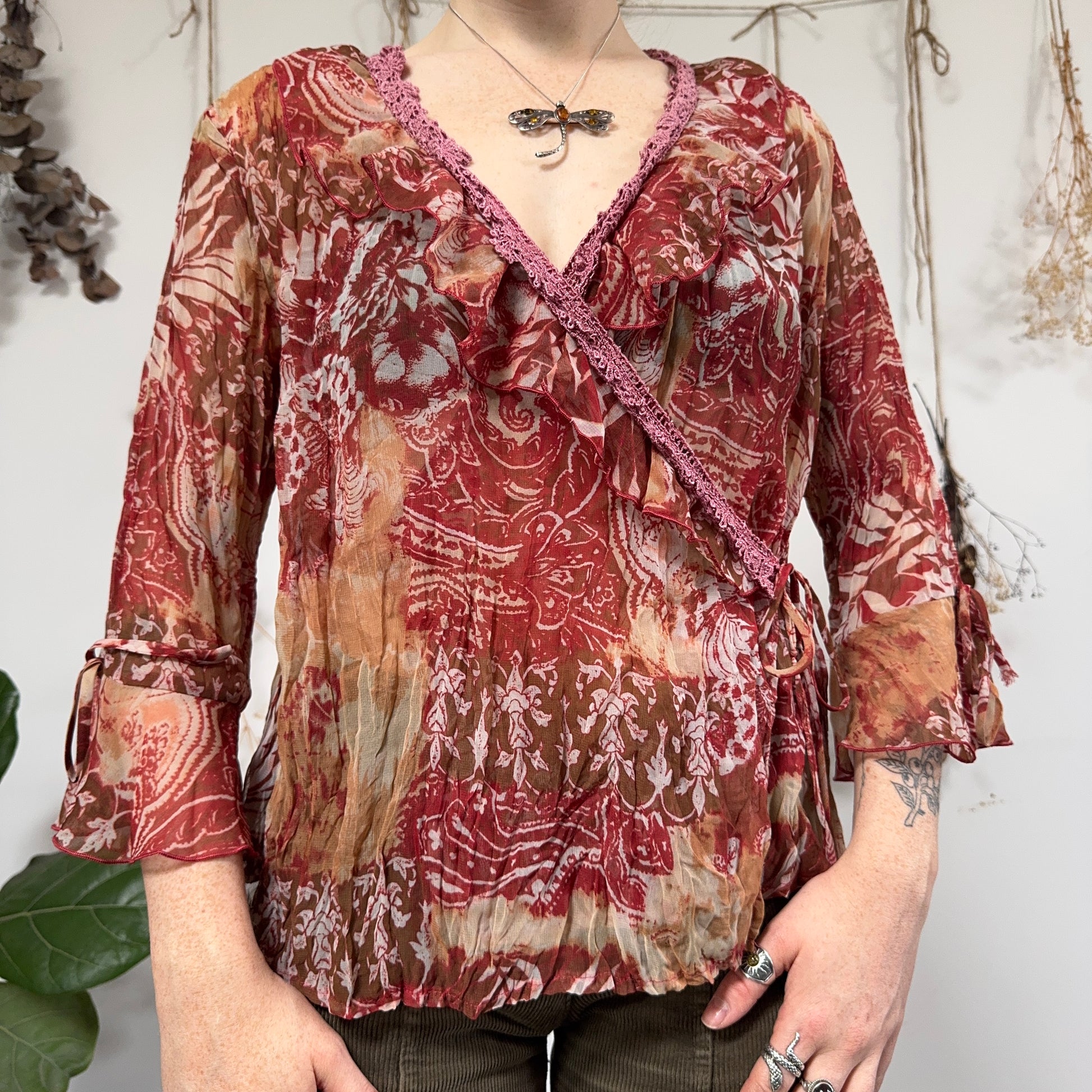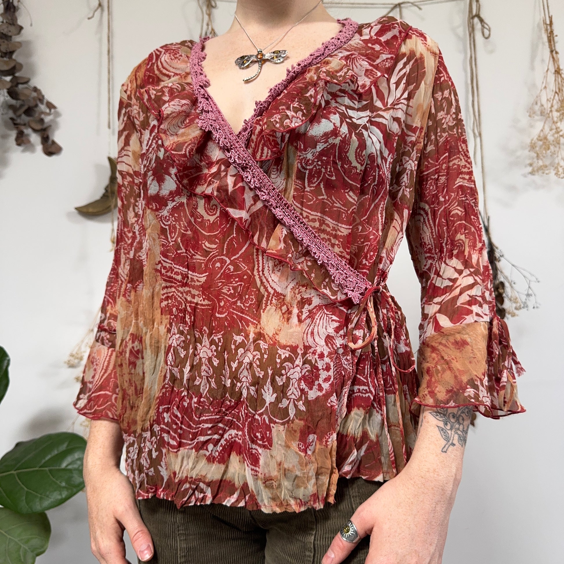 Vintage patterned crinkle wrap blouse with a pink lace trim
