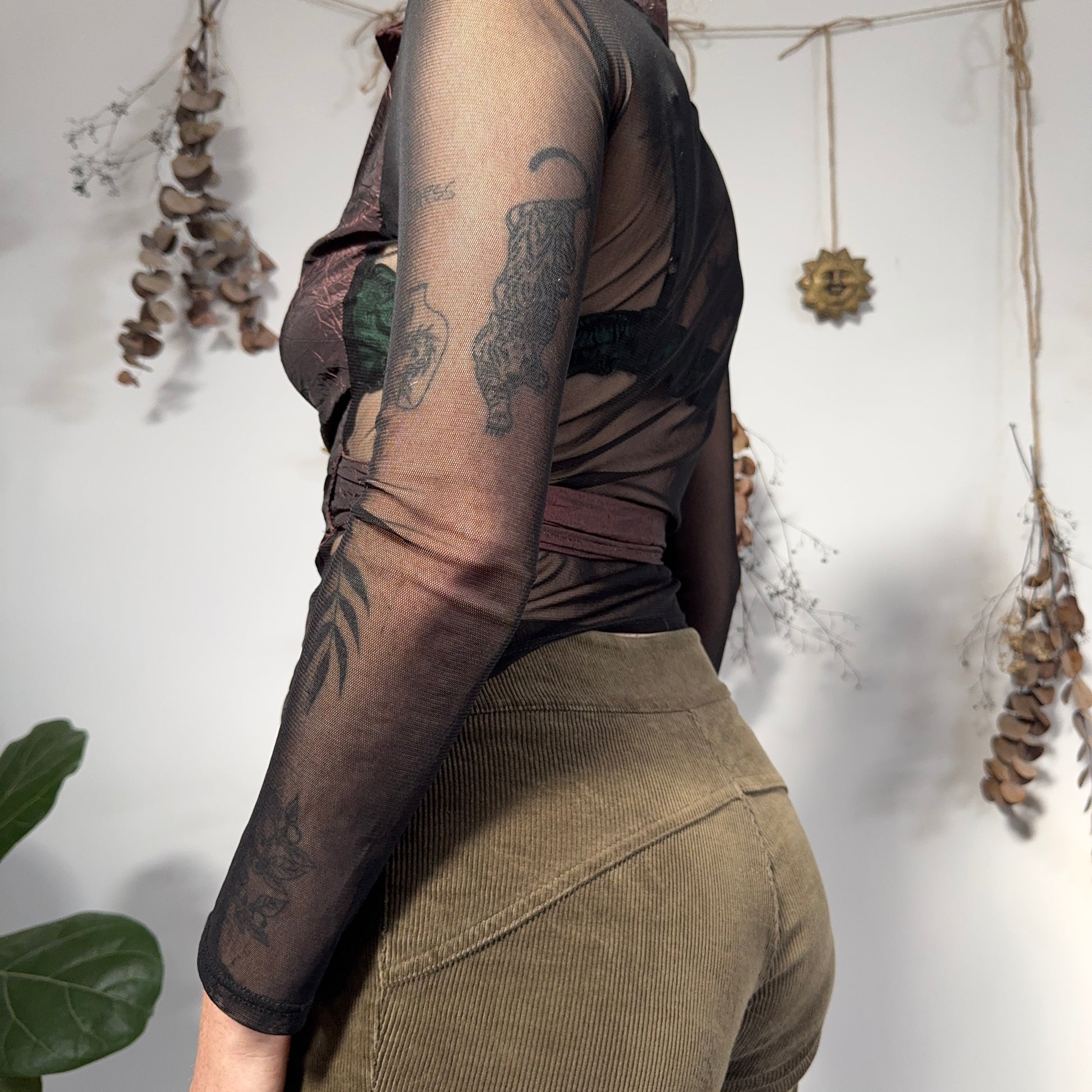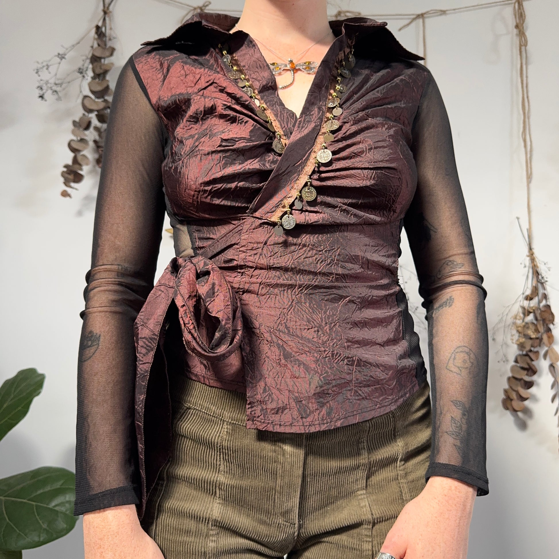 Vintage brown iridescent wrap shirt with black mesh sleeves and back